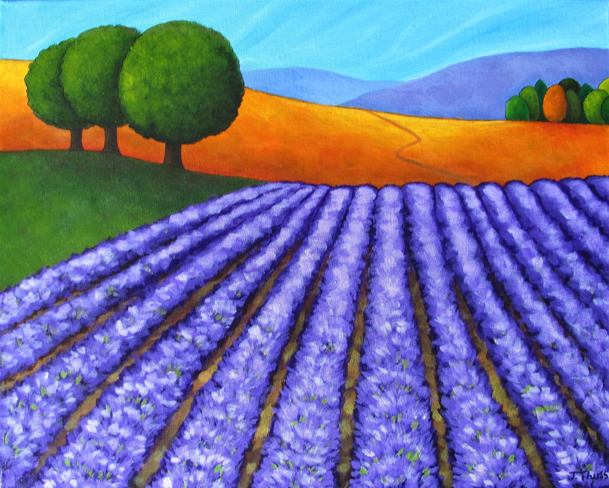A beautiful summer view of a field of purple lavender stretching out to yellow fields, trees, a country road and purple mountains in the distance.
