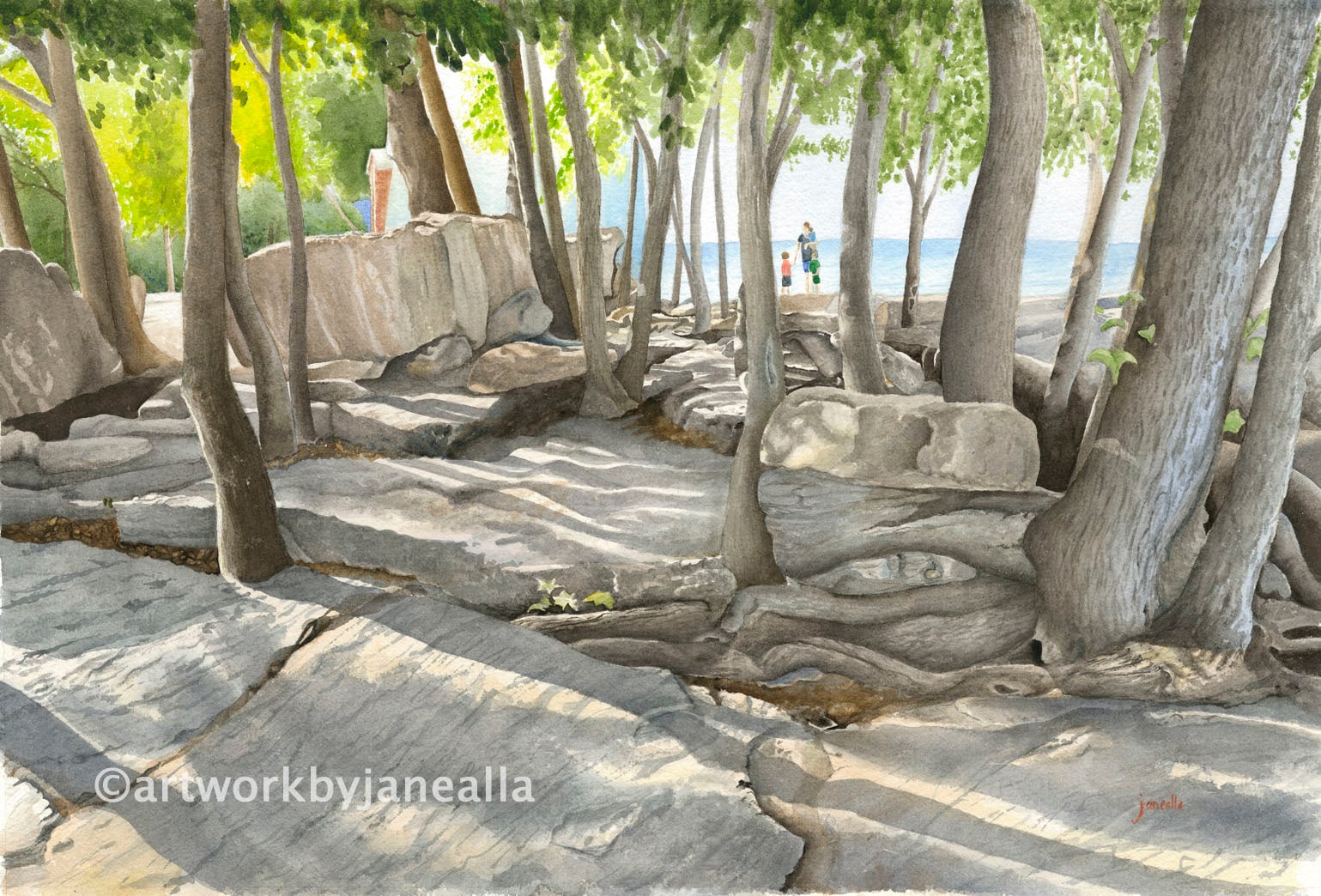 Late afternoon sun through the trees and on the rocks behind the Marblehead Lighthouse, Marblehead, Ohio. Painted on 140# Fabriano paper using Winsor & Newton professional paint.