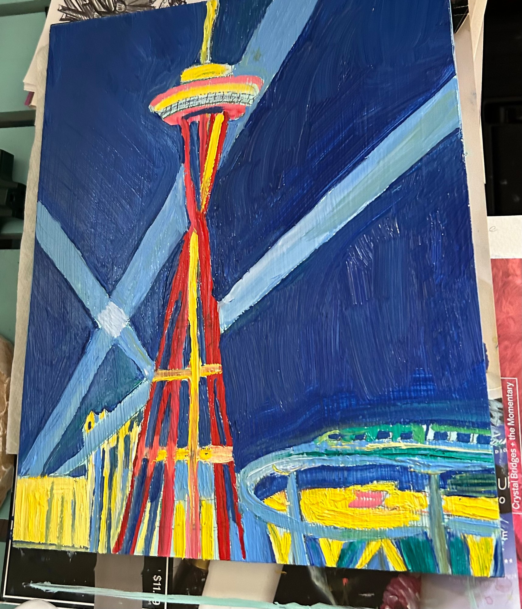 This was something I painted from my photos . I did this with Japanese drying medium and oil it dries very quick I think it makes it too shiny. I think it’s a study of something I wanted to do giant in a bigger red painting with a space needle.