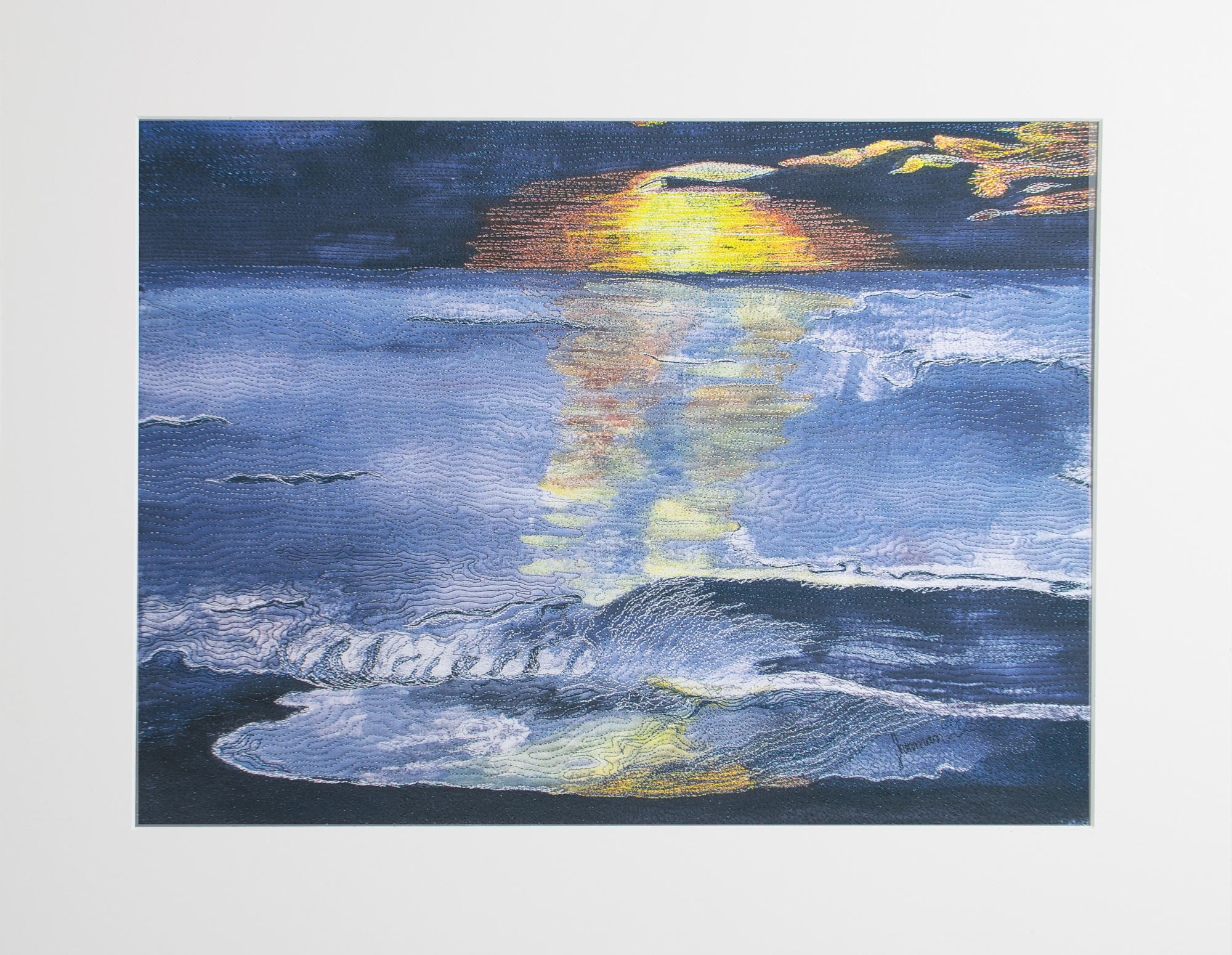 Paper reproduction 12 x 16 inches #1/5; created from high resolution image of original textile artwork. Limited edition printed image is surface sealed, numbered and signed by artist. Includes single mat in white to fit reproduction to 16x20 frame (frame not included).