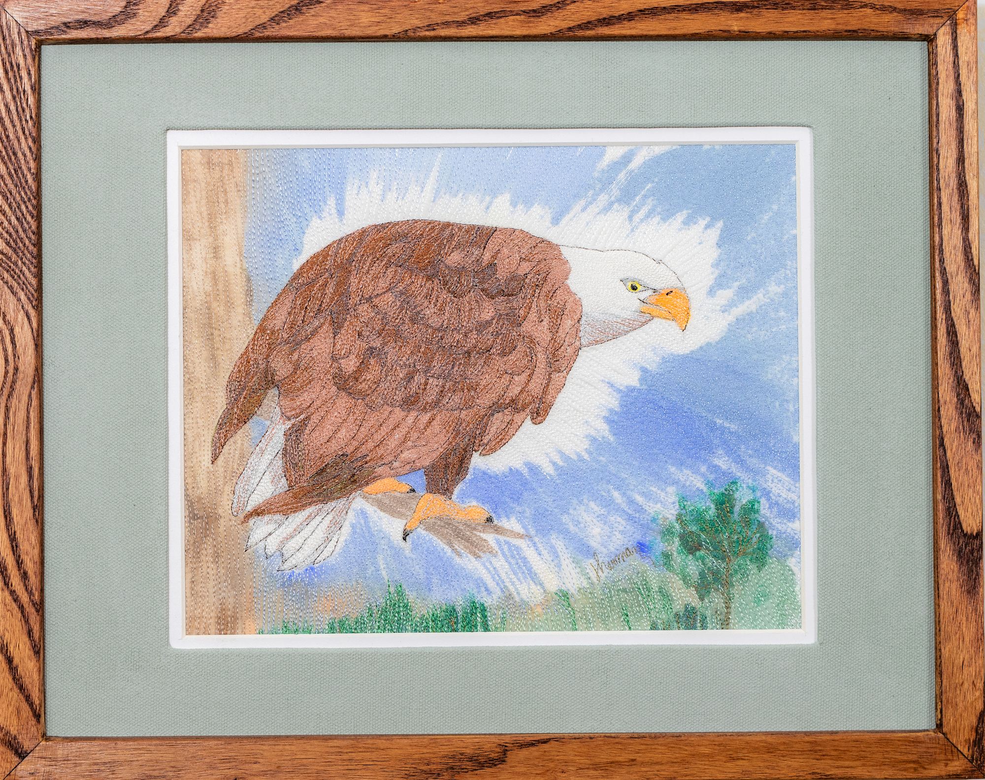 Fabric painted on white cotton. Batting and Backing added. Detailed with hand manipulated free motion machine stitching. Stretch mounted over a board, custom green painted canvas matted and oak framed by artist.