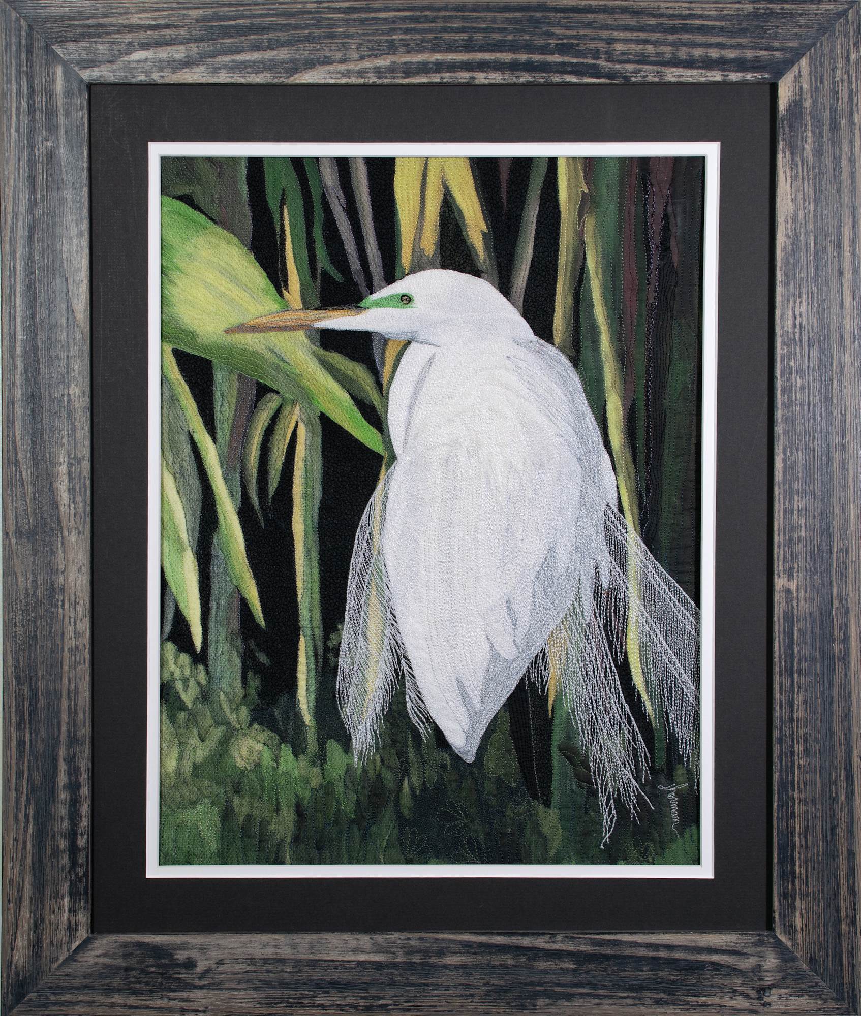 This stitched fabric artwork was created from the artist's original painting. Polyester batting and cotton backing are added. It is fully embroidered by hand manipulated free motion machine stitching. The finished artwork is stretched over a foam board and taped. Double matted and framed as shown. Includes Museum Glass for ultimate clarity and UV protection.