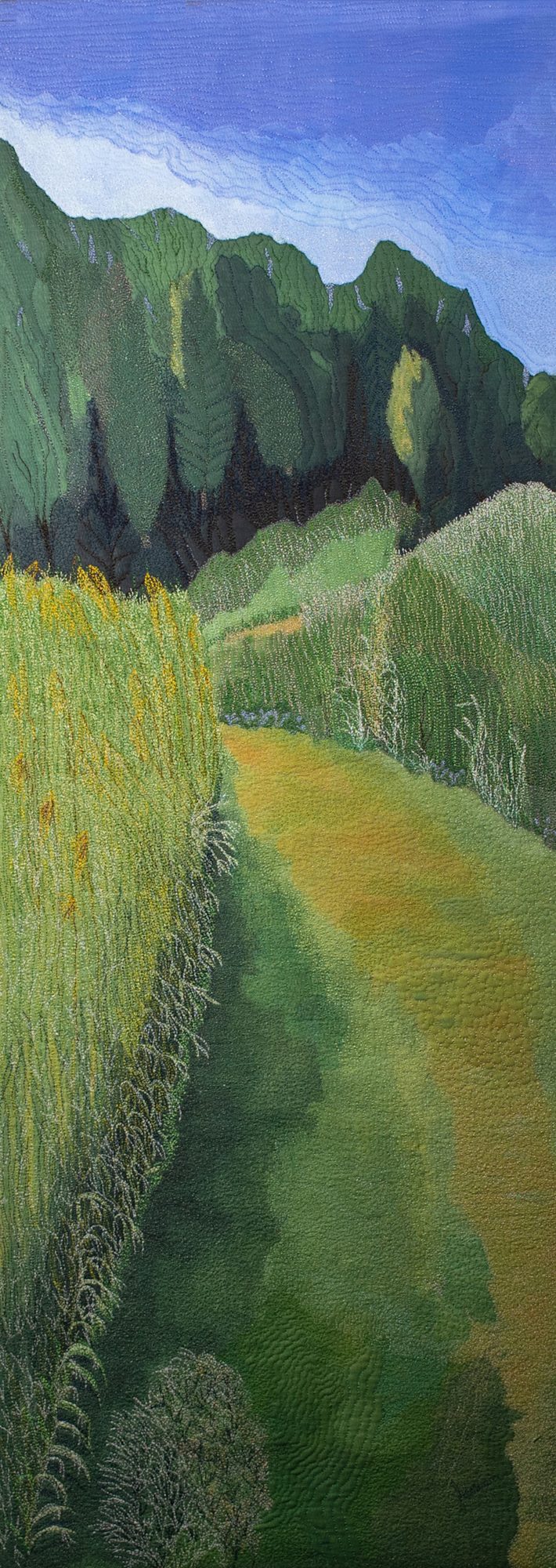 This stitched fabric artwork was created from the artist's original painting. Polyester batting and cotton backing are added. It is fully embroidered by hand manipulated free motion machine stitching. The finished artwork is stretched over a gallery canvas and stapled. Stitching is visible along the sides. Frame included as shown or available without. UV spray treatment of fabric.