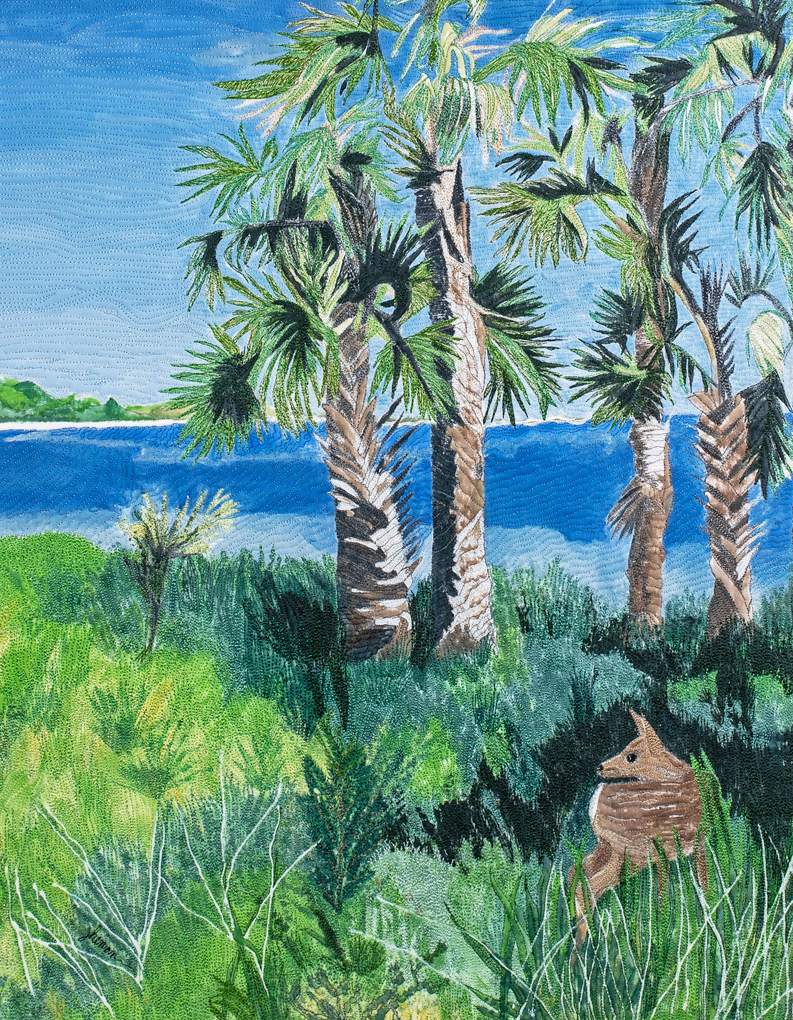 Gulf Island Overlook is acrylic fabric painted and embroidered by hand manipulated free motion machine stitching. Polyester batting and cotton backing has been added. The finished artwork is stretched over acid-free board and taped. 16x20 wood frame includes Museum Glass for UV protection and ultimate clarity.