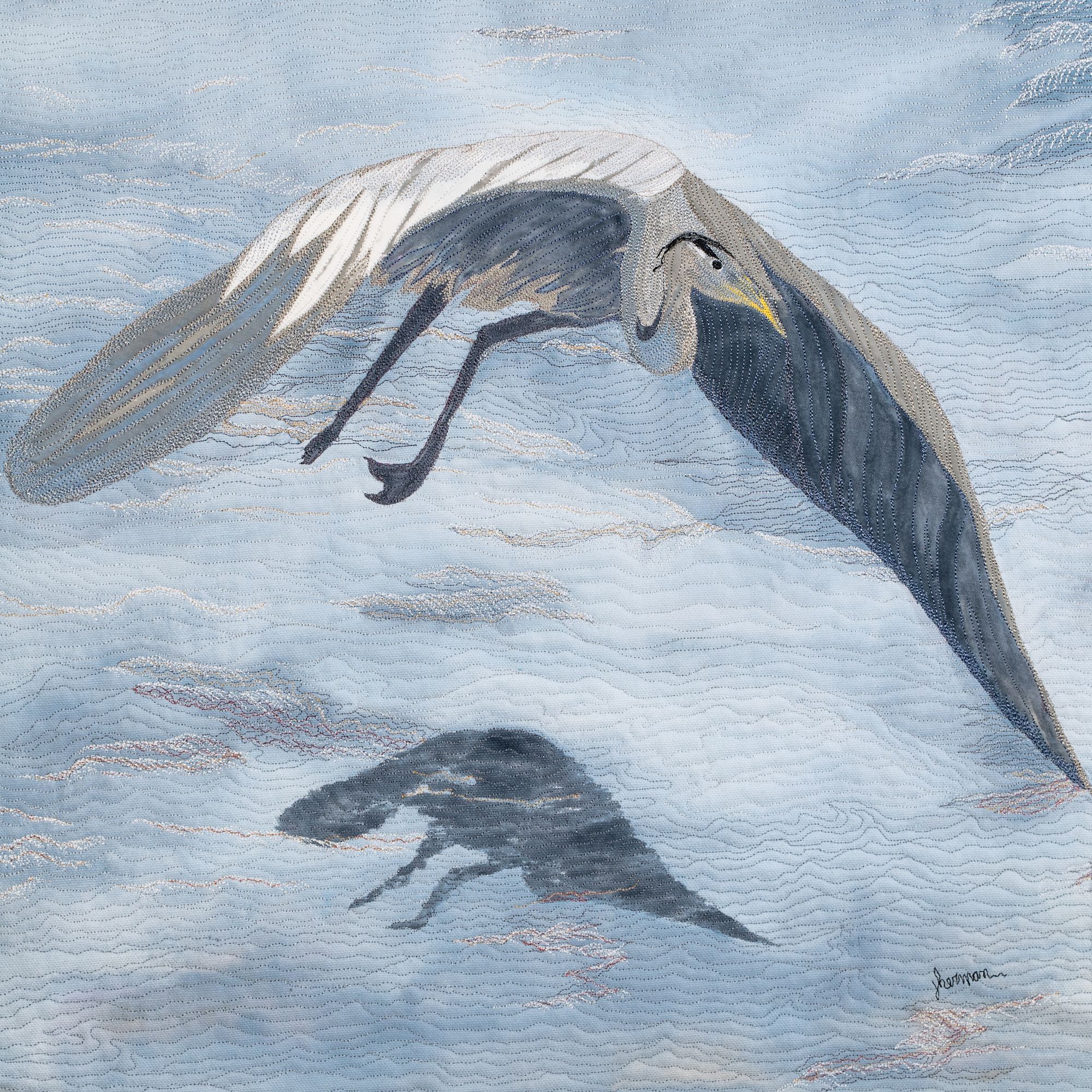 Subtle gold threads outline and accent blues and grays of this sea scene. Original background fabric painted on cotton and overlayed with threads with free motion machine embroidery technique. Fabric art is stretched over acid-free foam board and framed.