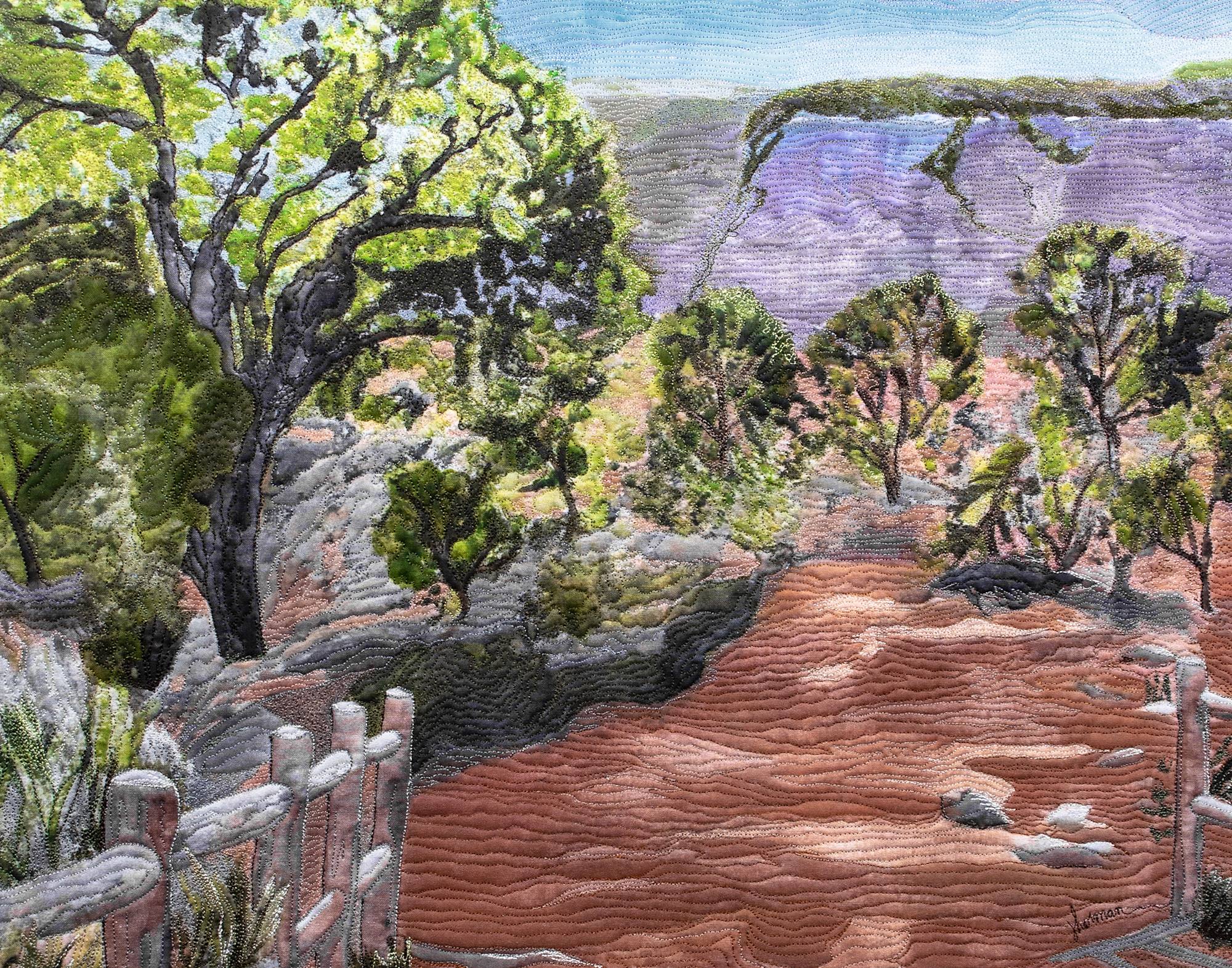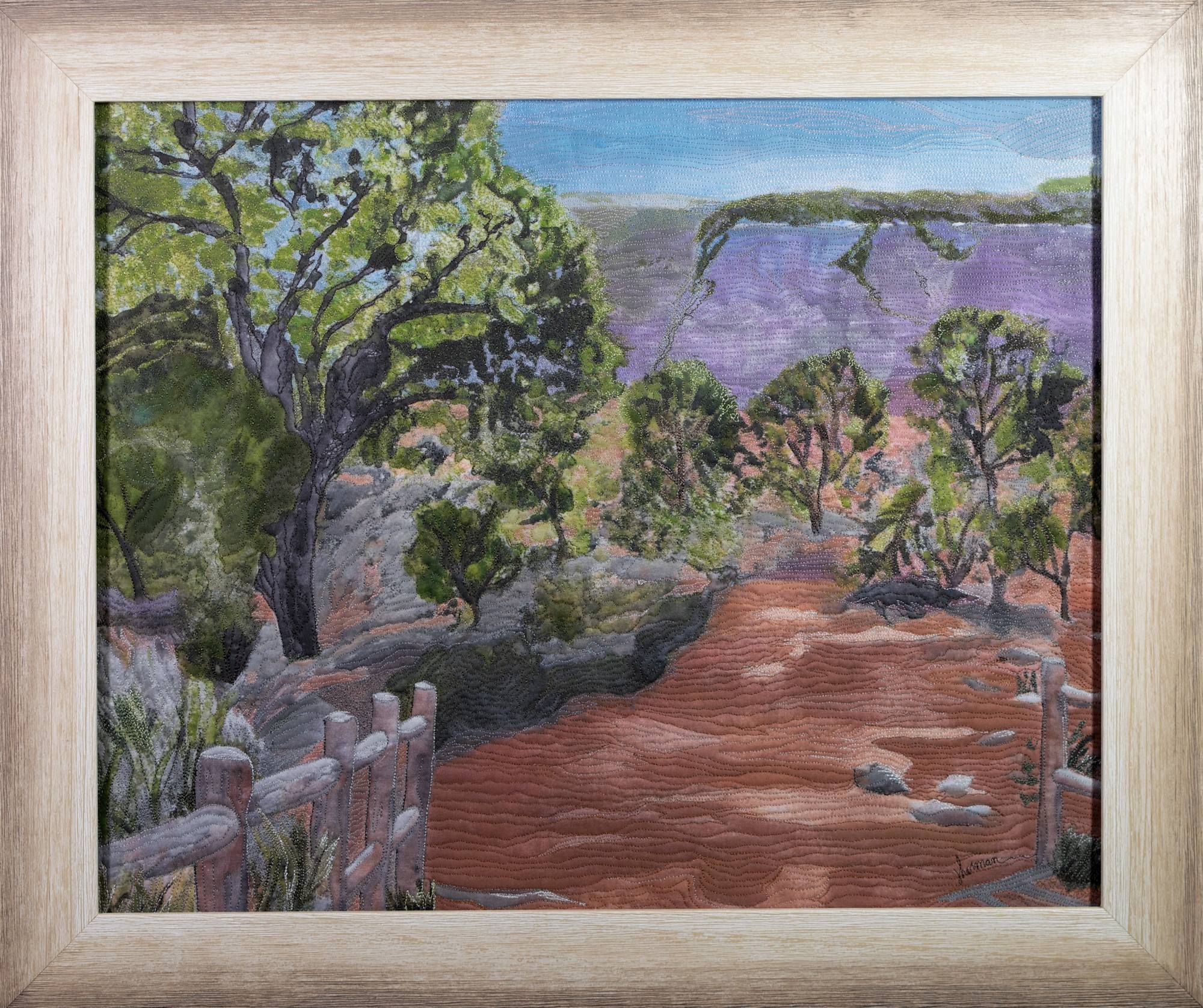 This stitched fabric artwork was created from the artist's original painting. The artwork is on cotton/linen. Polyester batting and cotton backing are added. The artist's technique includes hand manipulated free motion machine stitching throughout. Finished art is stretch mounted over canvas and installed in black float frame. (Not currently as shown in images).