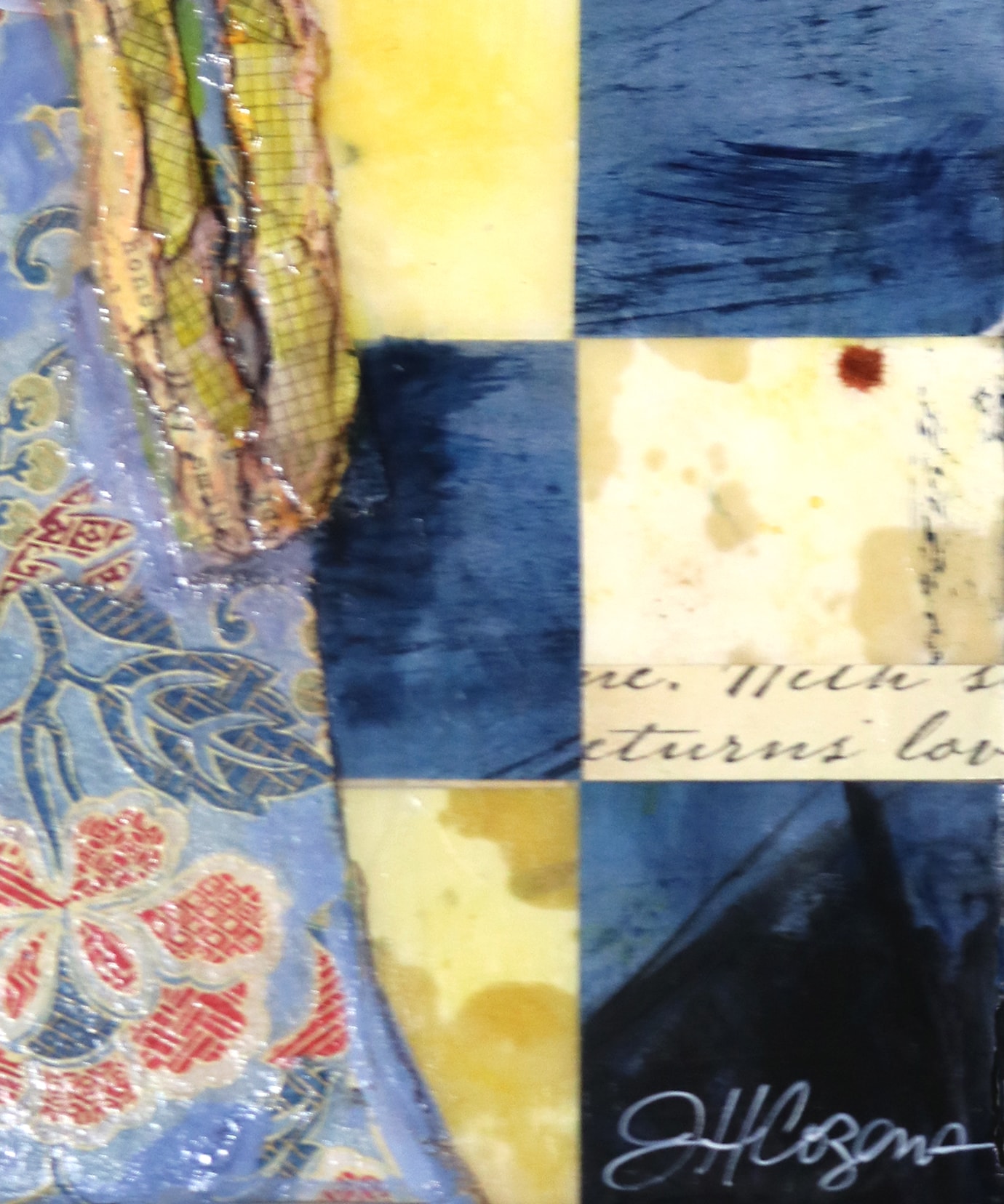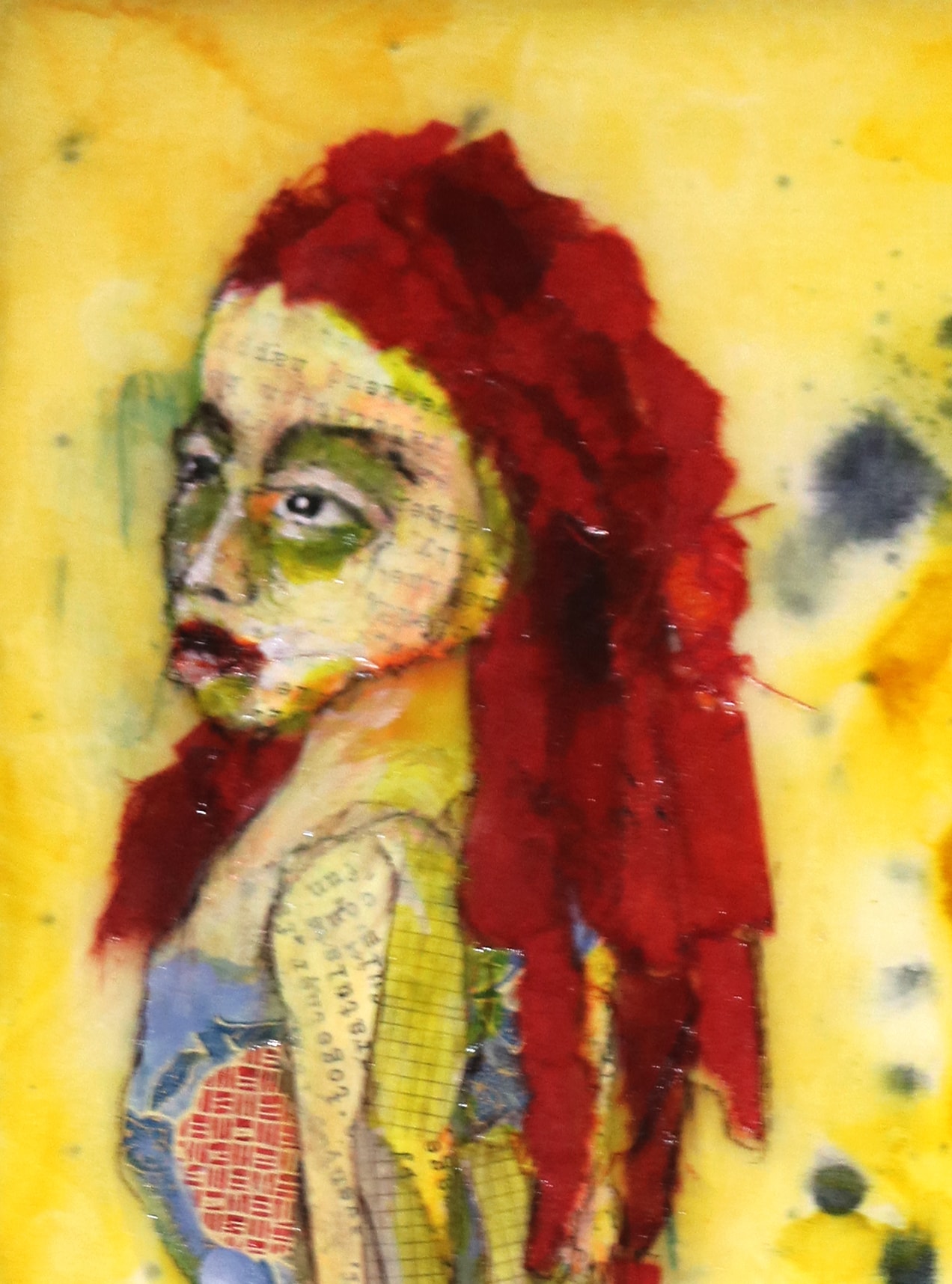 Created with layers of handprinted and painted papers, Japanese washi, paint, and ink separated with multiple layers of resin for a depth and complexity. The layers contain items that sometimes show and sometimes are hidden but they are there, part of the portrait of the inner person.
