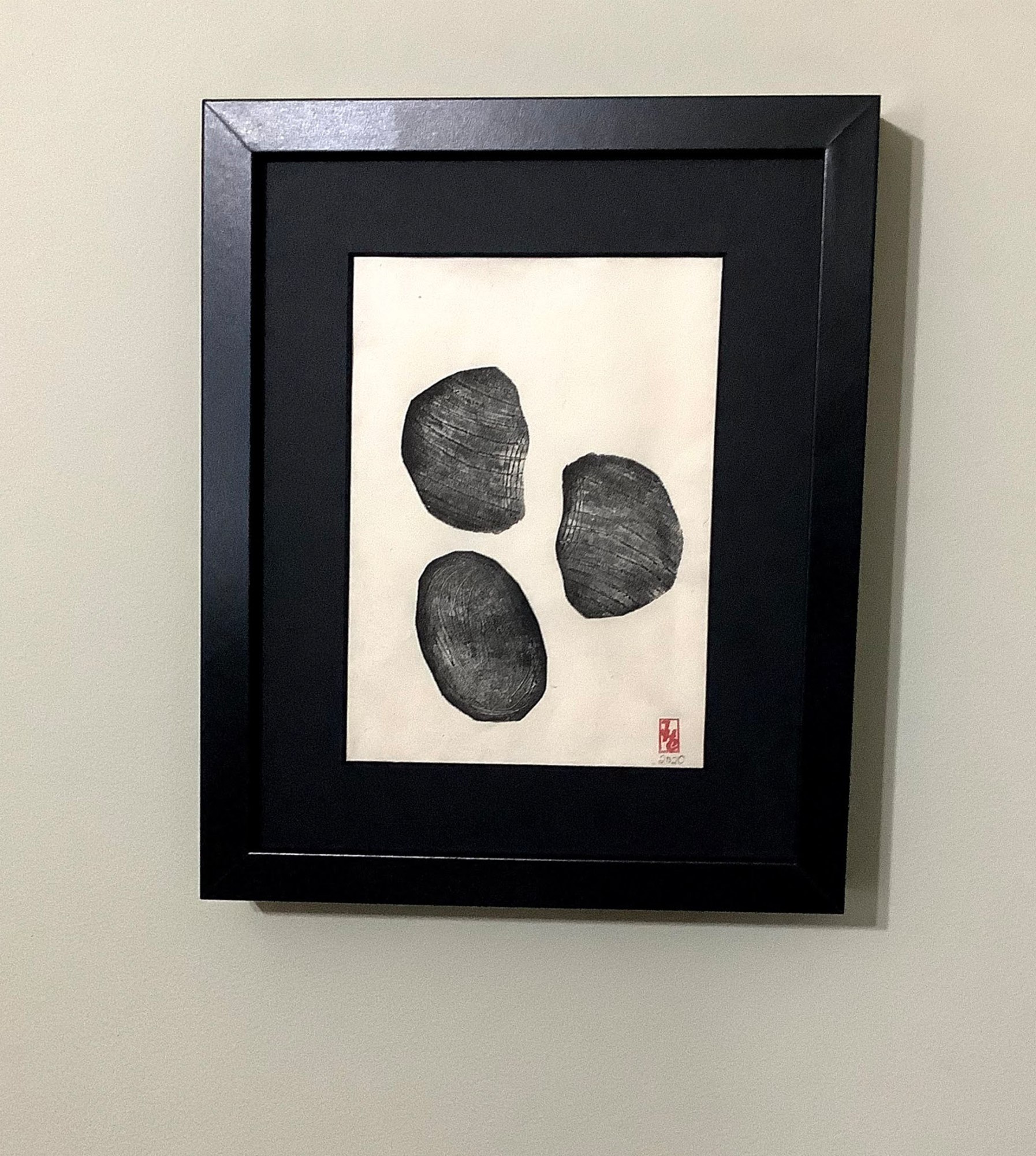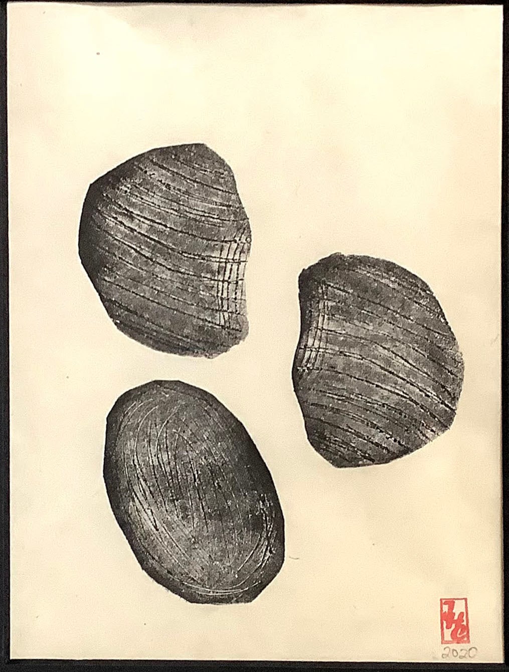 "This print was created using a technique that uses both carving and etching on linoleum. Pebbles are a fascination of mine because of their random but beautiful shapes."