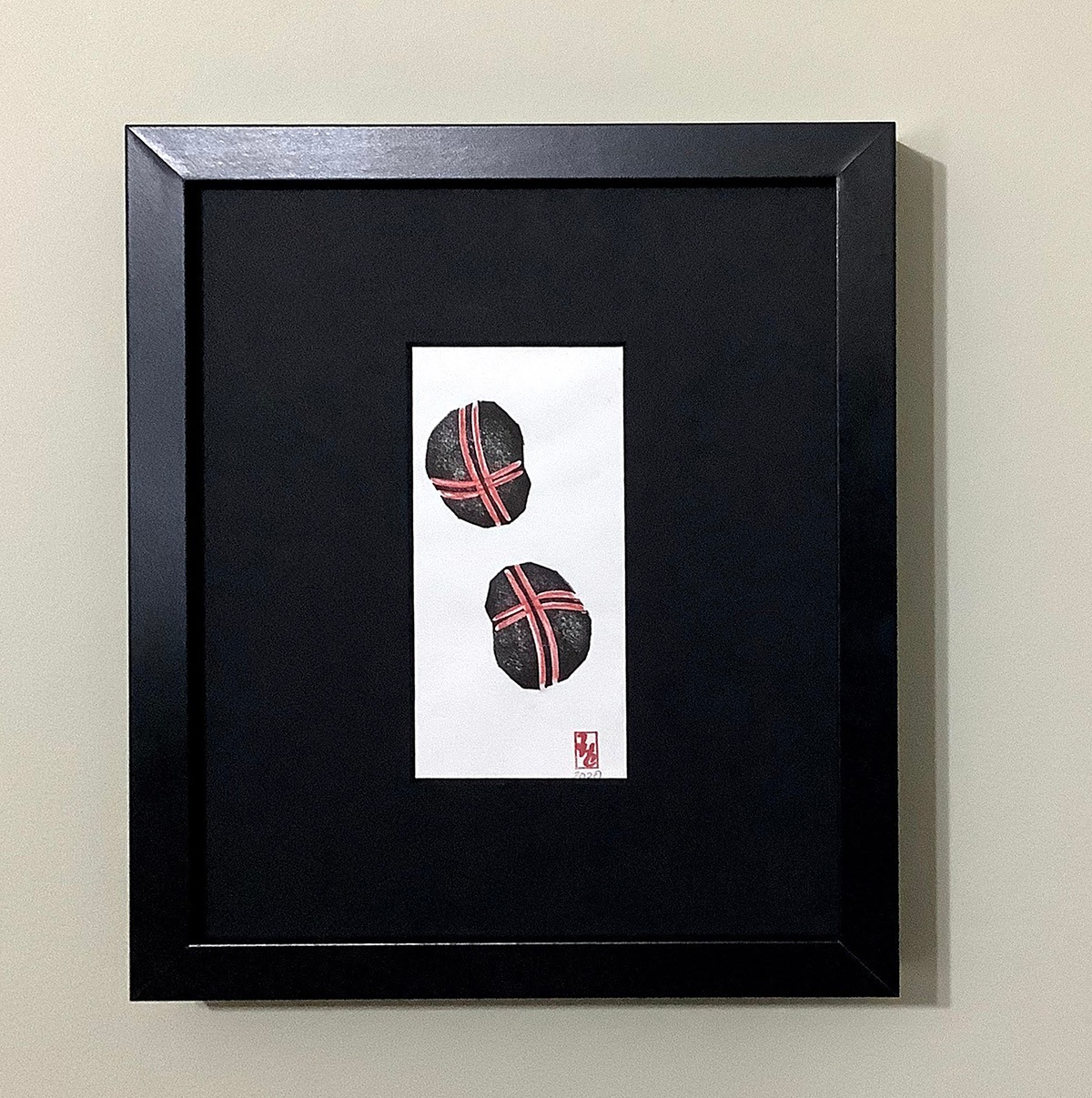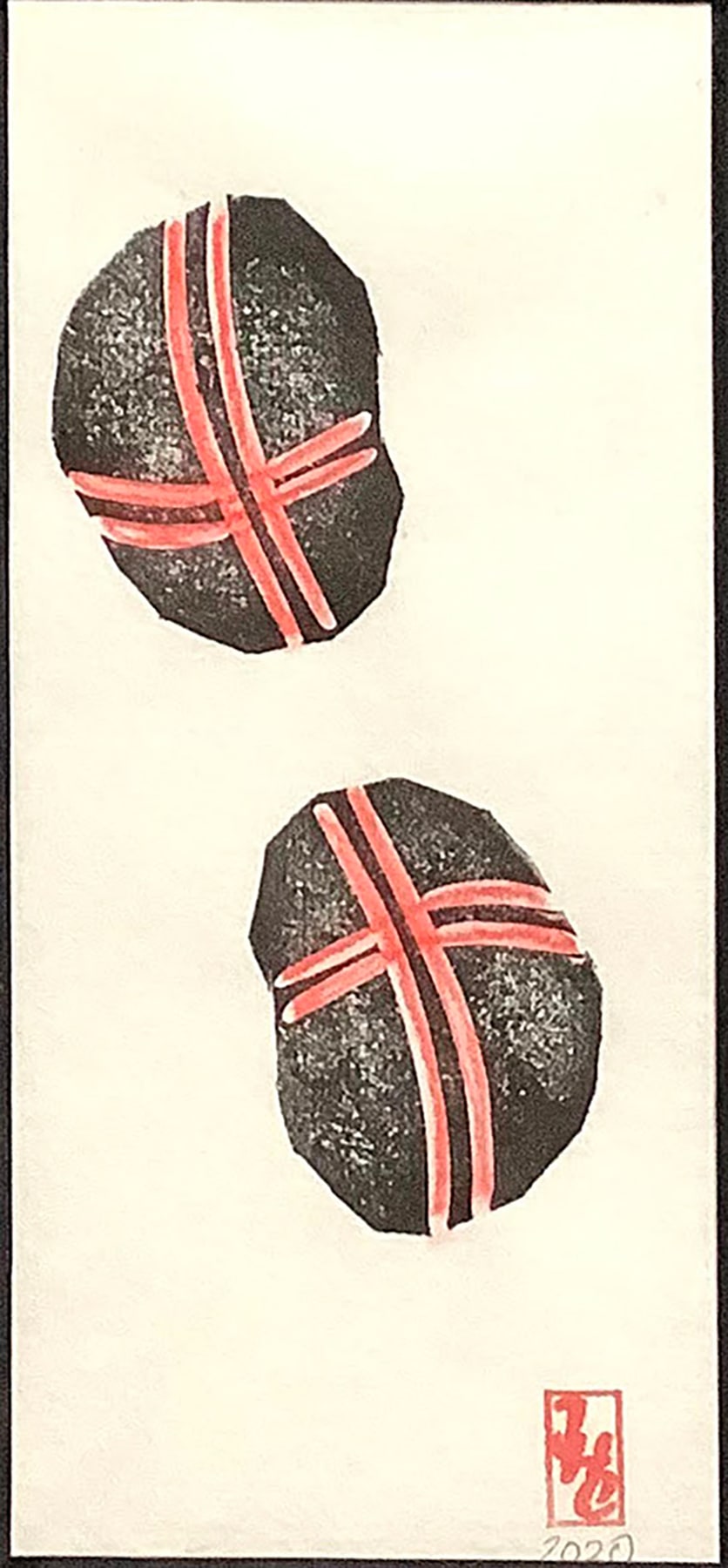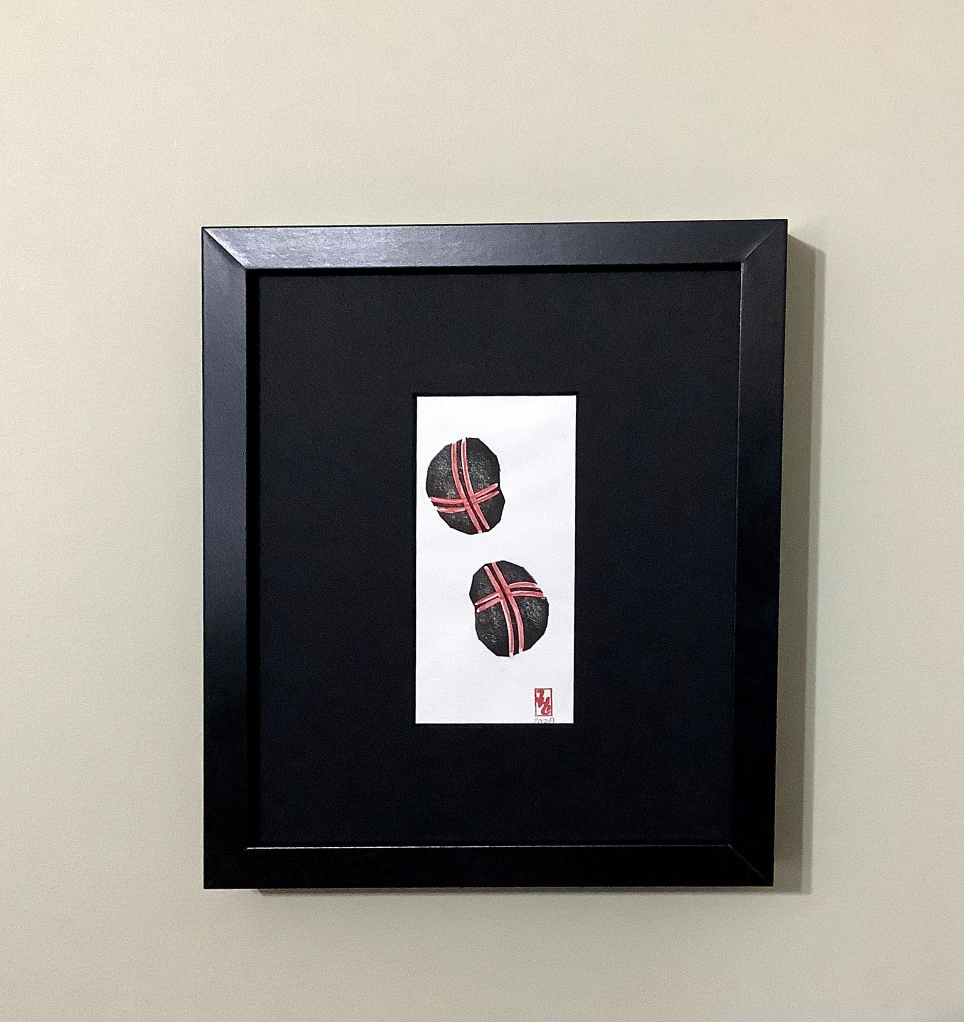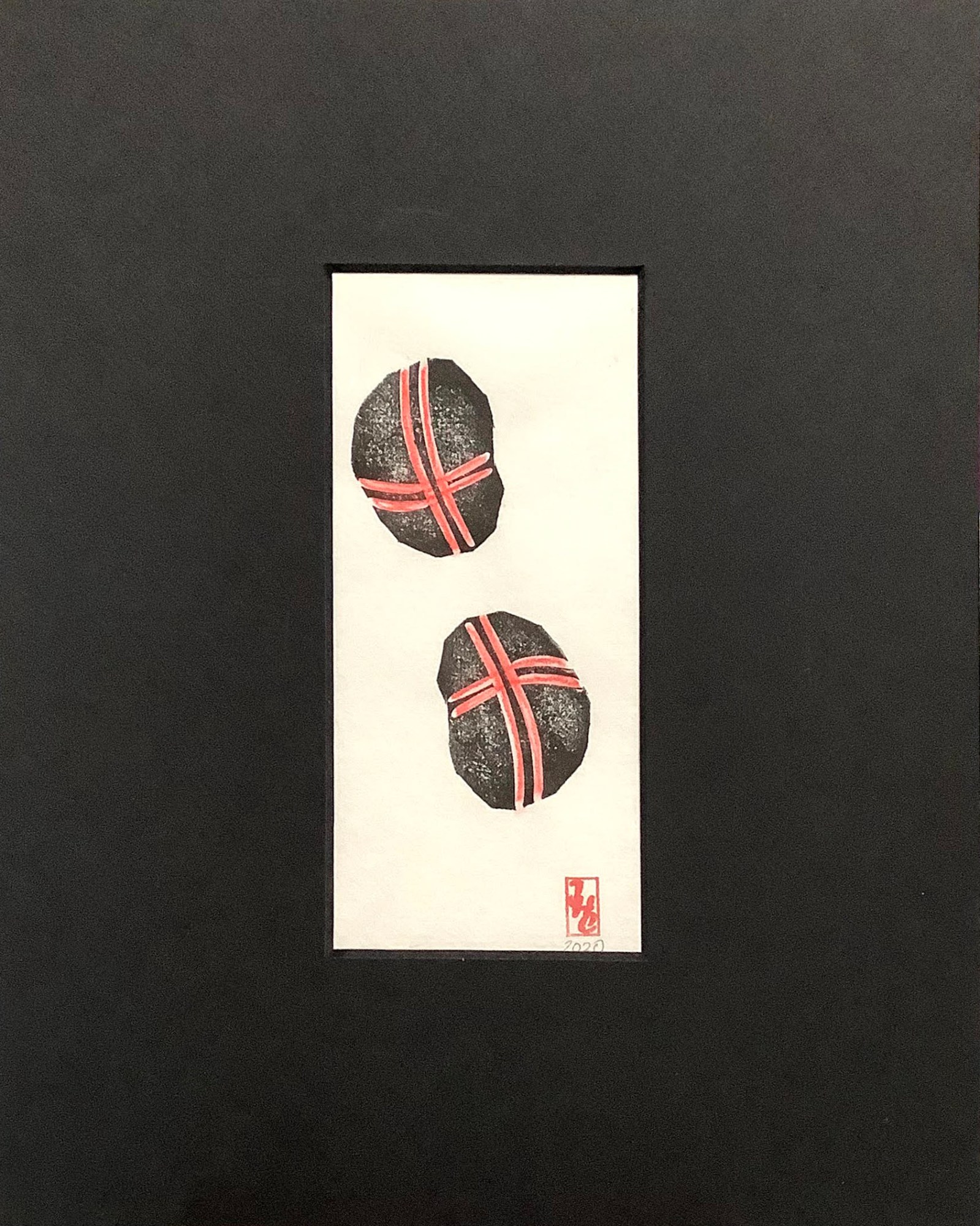"This print was created using a technique that uses both carving and etching on linoleum. Pebbles are a fascination of mine because of their random but beautiful shapes."