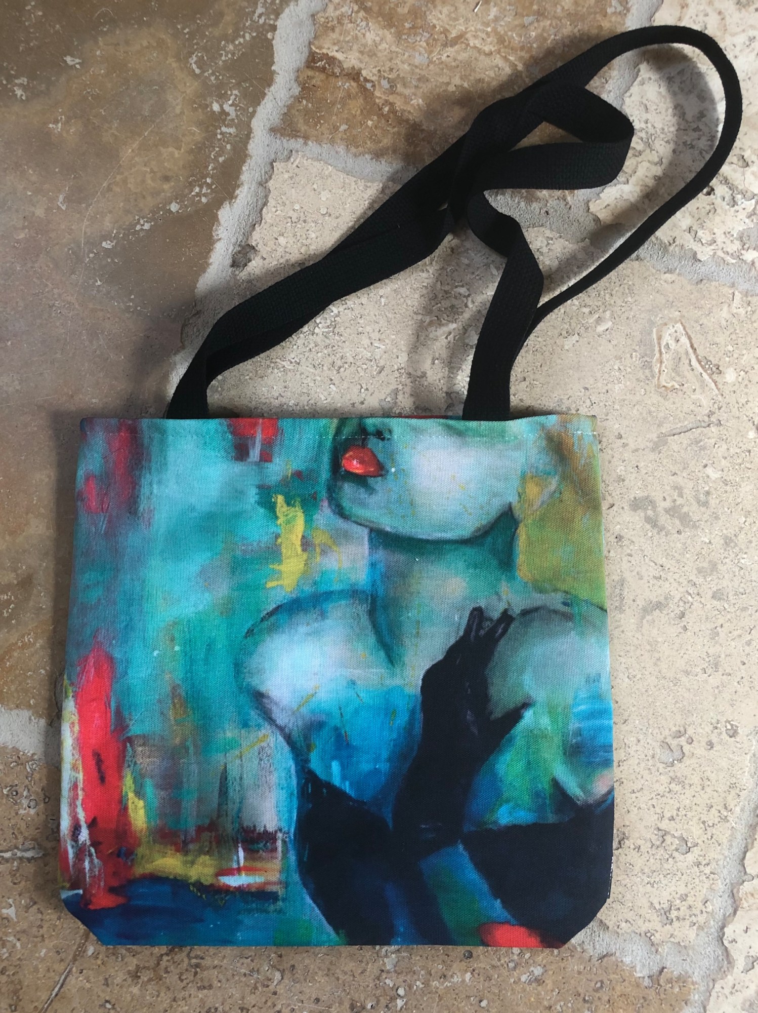 This quality canvas book bag with my art, “Dinner at the Ritz” is available. If you ever need a shopping bag, book bag, or any bag to carry your treasures, this one would look colorful and stylish.