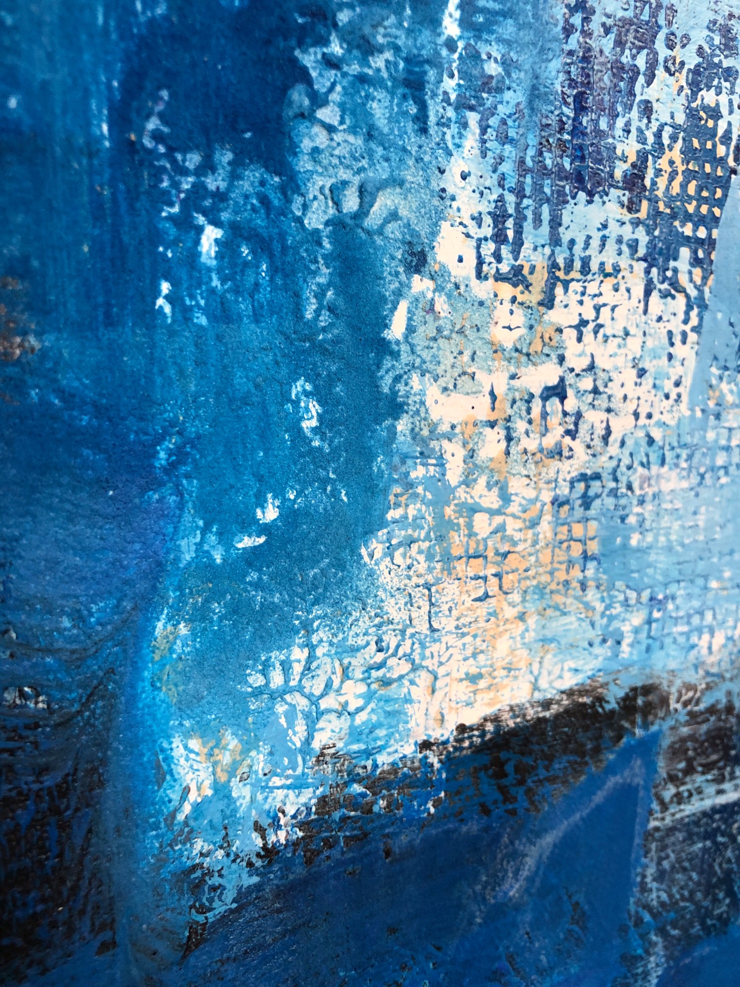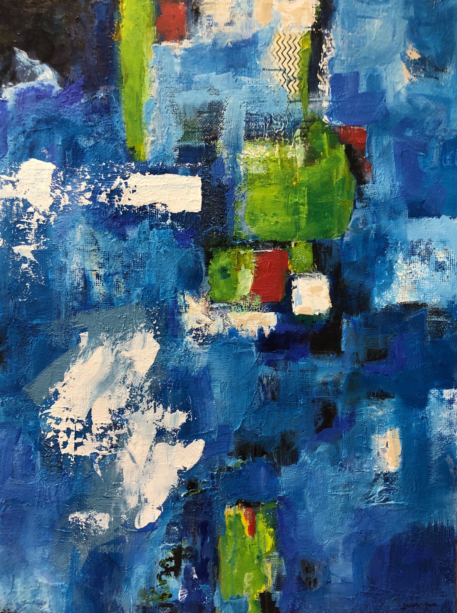 This heavily textured abstract has clouds, a ship, a reflection, a flag or whatever else you see. I love to concentrate on the texture. It gives new life every time I gaze on it.