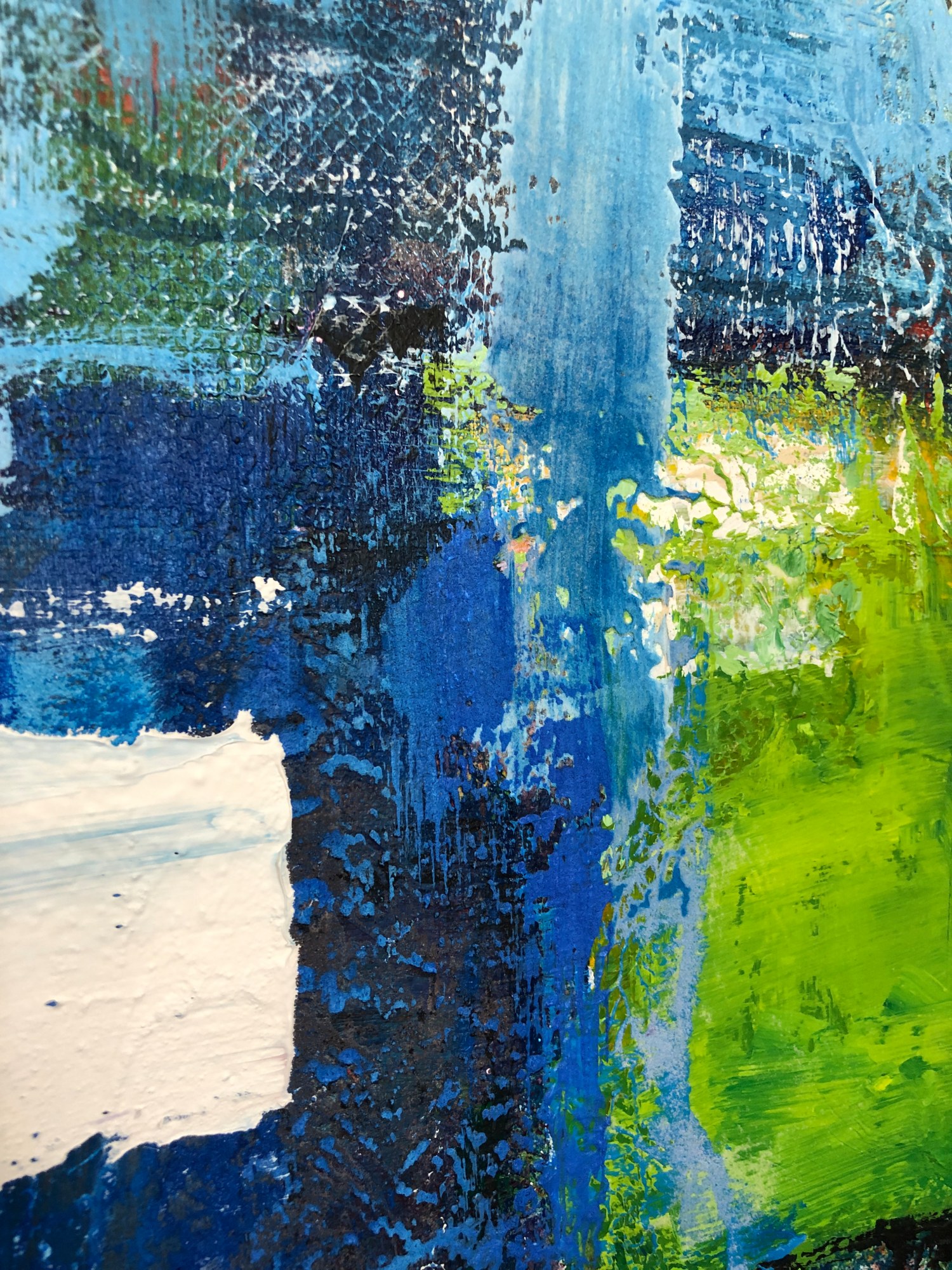 This heavily textured abstract has clouds, a ship, a reflection, a flag or whatever else you see. I love to concentrate on the texture. It gives new life every time I gaze on it.