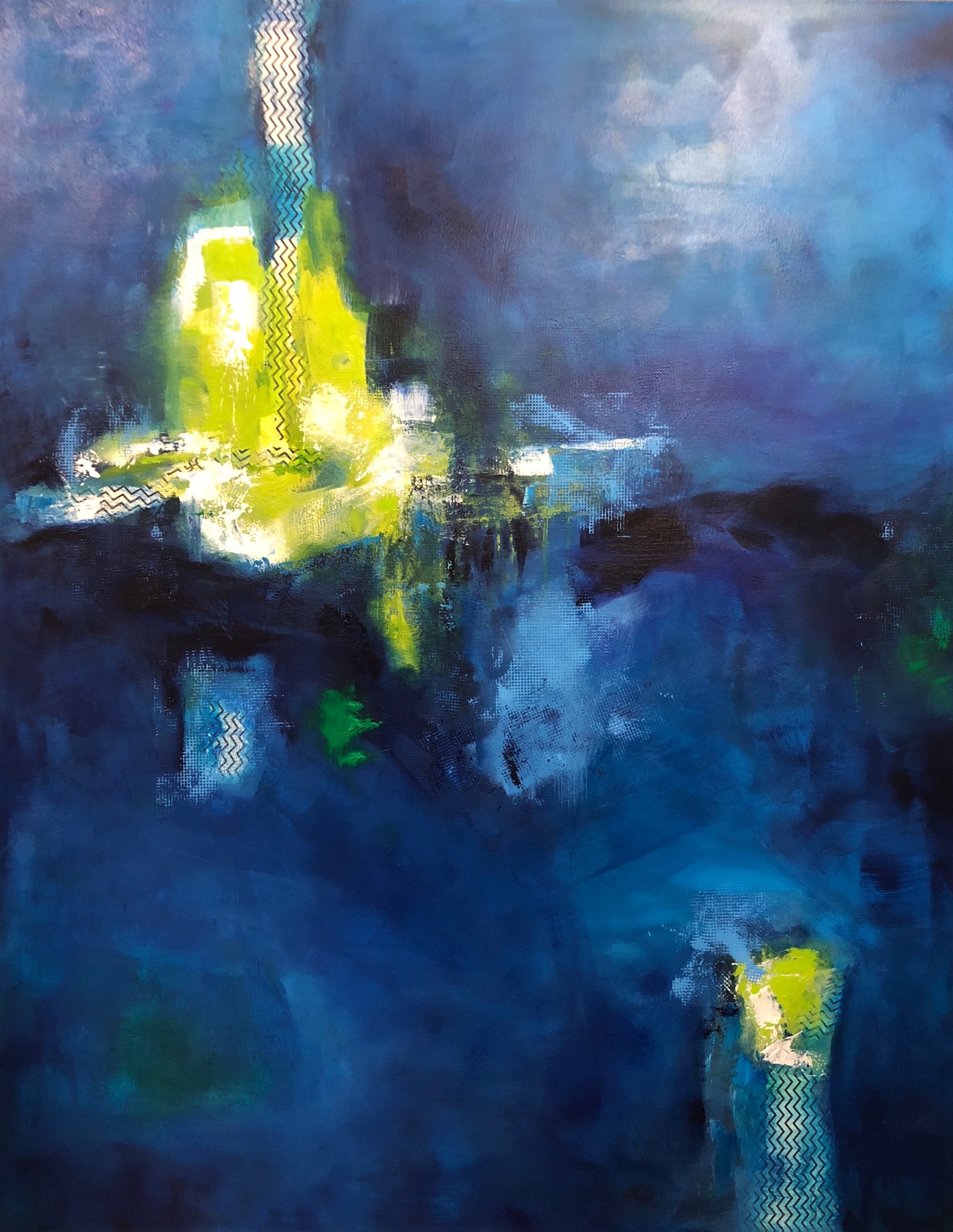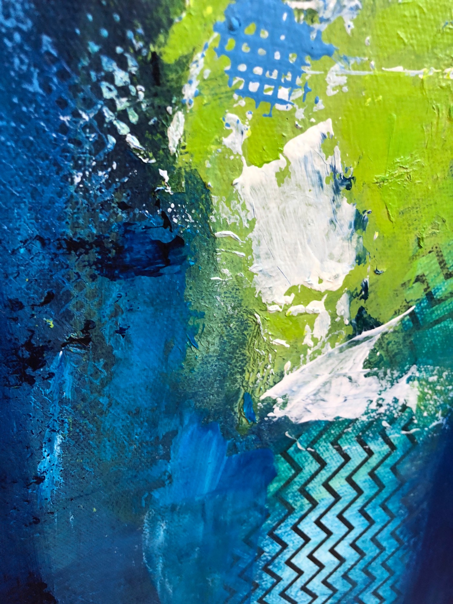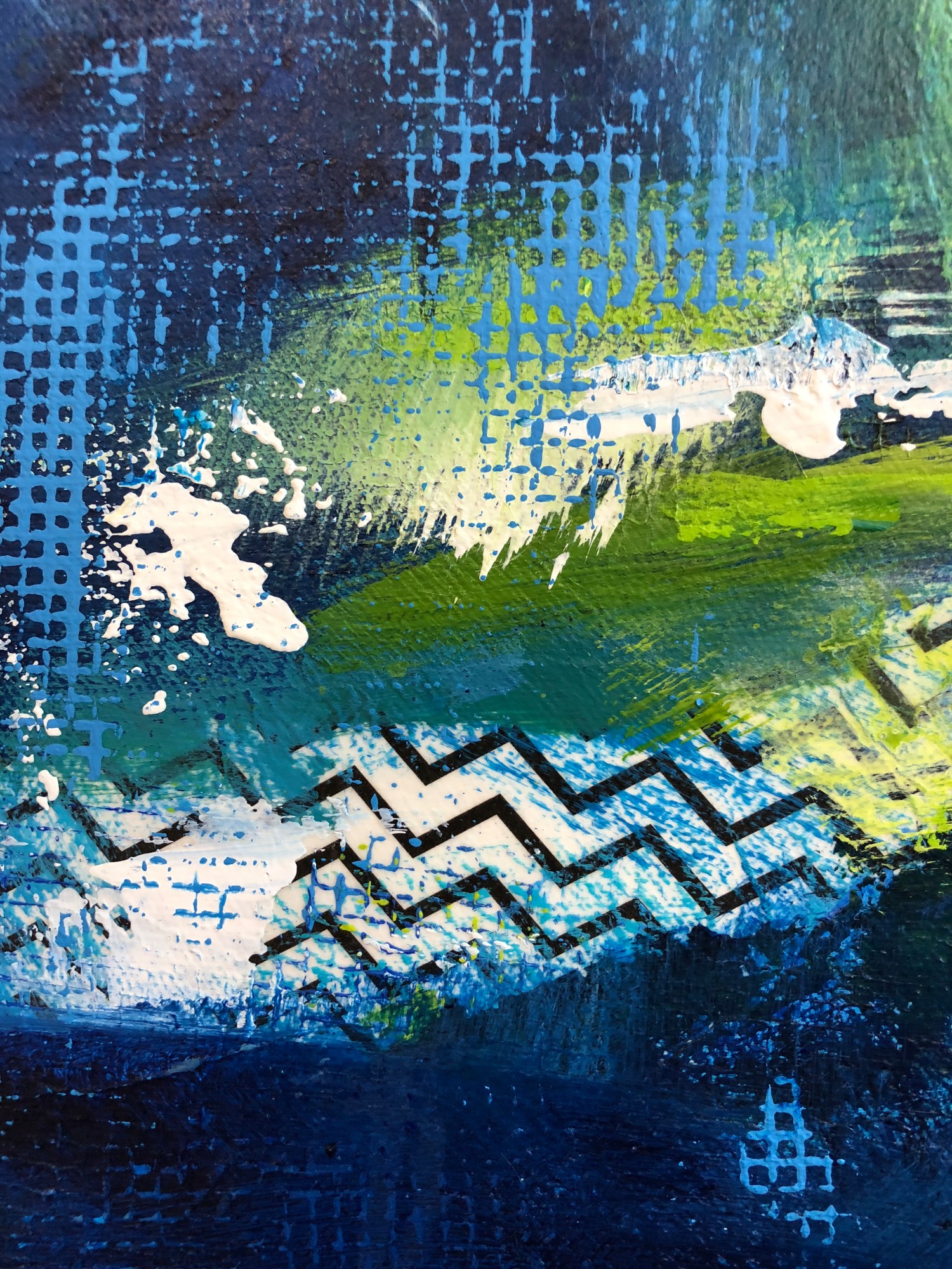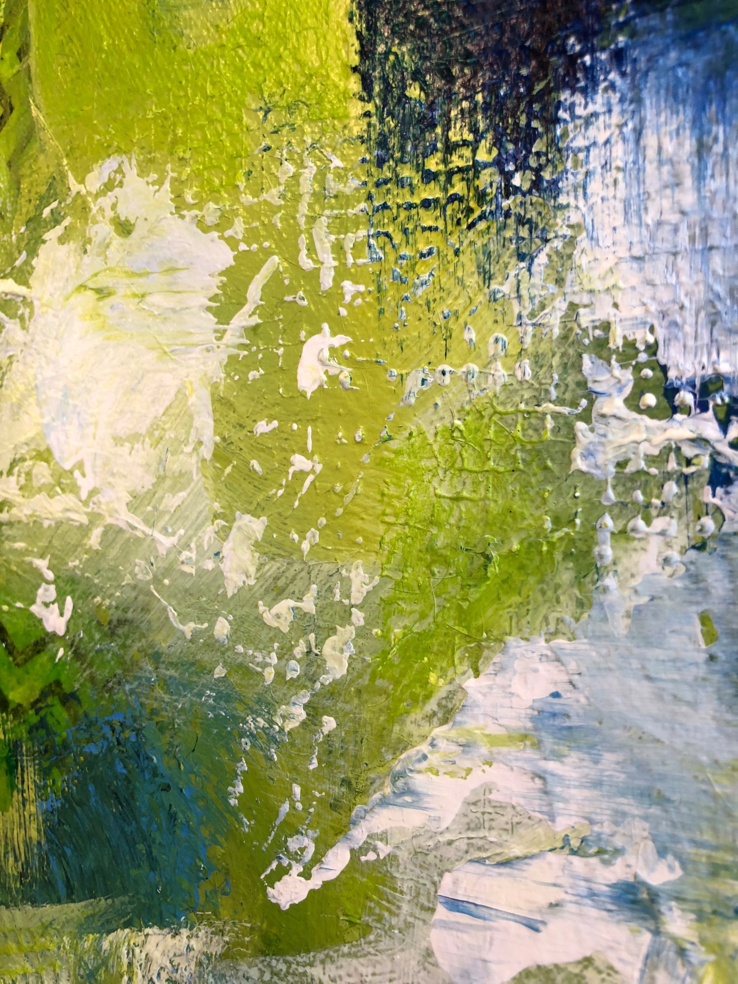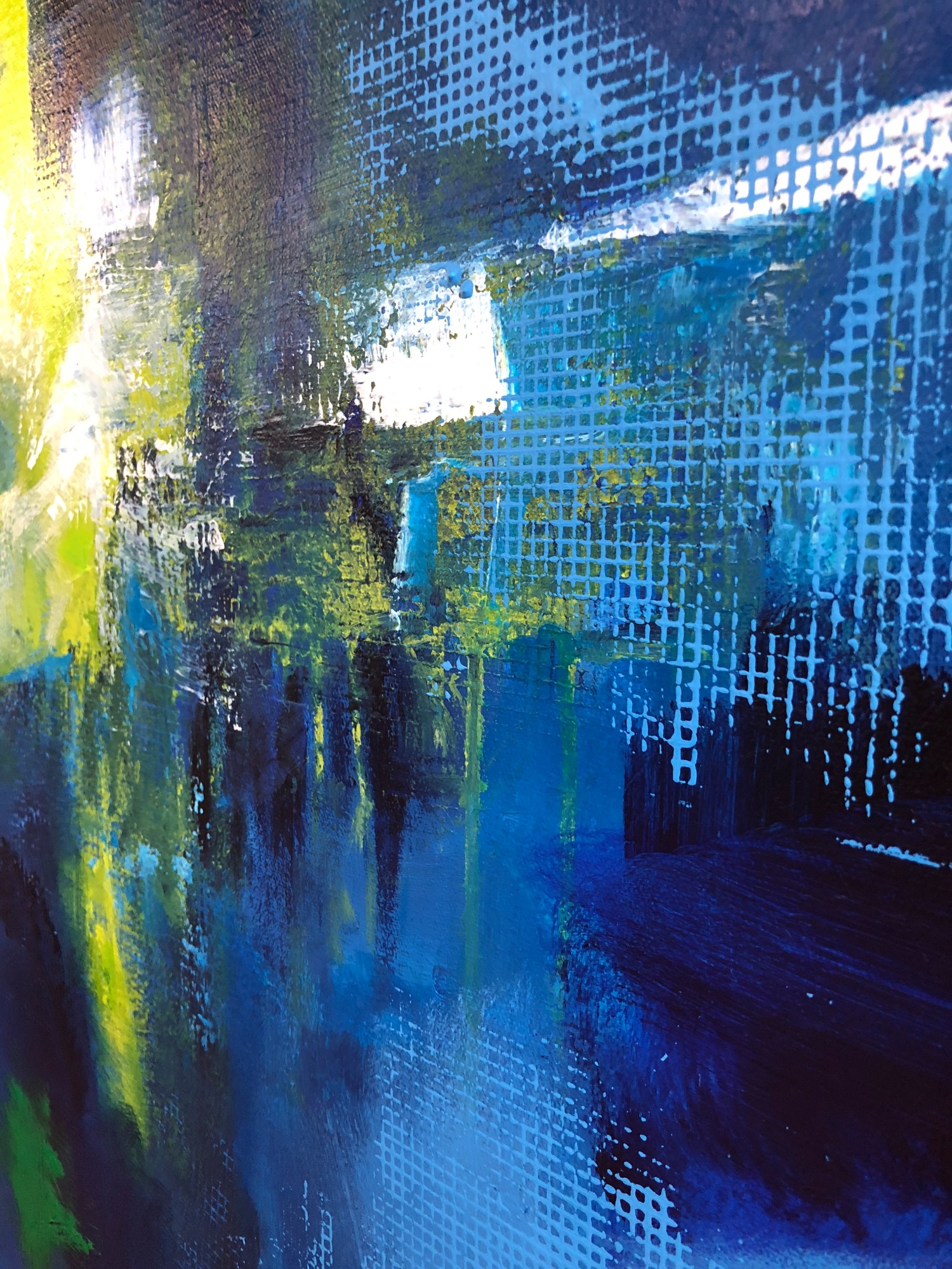 This wonderful painting is big and dramatic with shades of blue strung throughout. The layers bring depth and complexity as you pinpoint your gaze. The greens in this painting pop and come alive as you follow the patterns and the strokes.