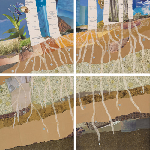 Commissioned work for a new Colorado hospital using the aspen tree as the theme for their art collection. My assignment was to highlight the roots of the trees. Little-known fact: a single aspen tree is actually just a small part of a larger organism. A group of aspen trees is considered a single organism with its main life force underground in an extensive root system. Collage on four panels. Available as a reproduction.