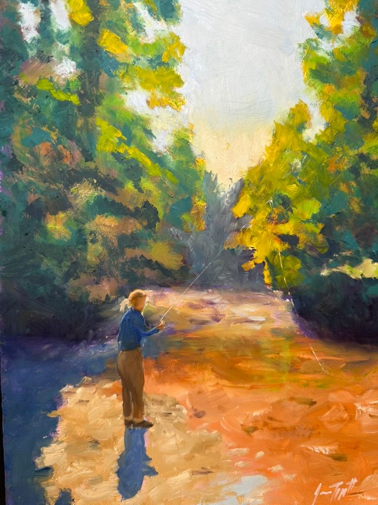 This painting captures a serene moment of solitude and connection with nature, inviting viewers to reflect on the tranquility found in simple pleasures. The composition features a lone angler standing in a gently flowing stream, surrounded by lush trees that embody the vibrant colors of the changing seasons.