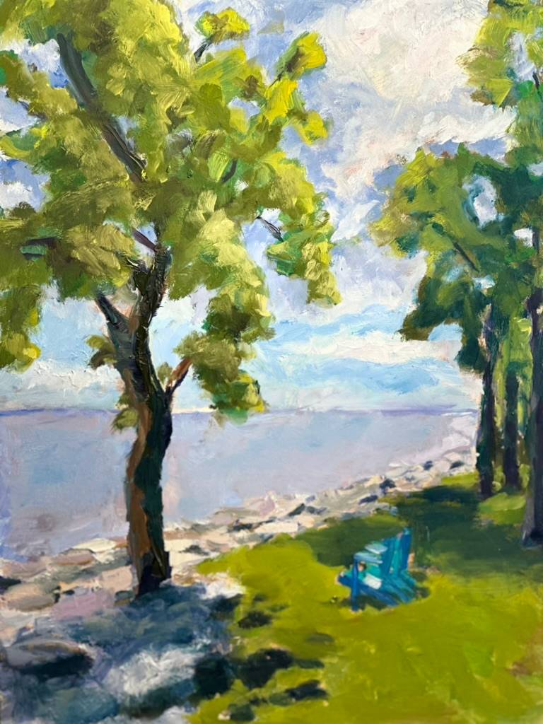 Loose, breezy brushstrokes carry the movement of leaves and light across the grass, while soft blues and greens hold the calm of the bay. The emptiness of the chairs is the subject: a gentle pause that suggests companionship just beyond the moment.