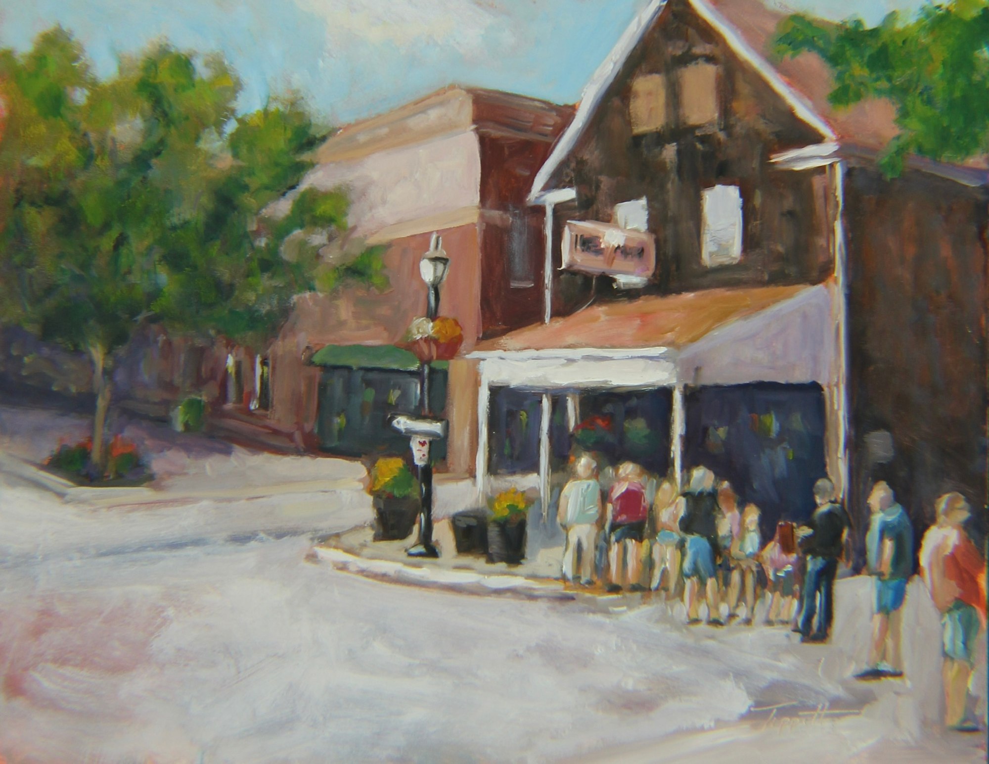“Waiting Patiently” depicts a charming scene outside an ice cream shop in Lewes, DE, where a line of eager customers gathers in anticipation. The inviting storefront and the vibrant atmosphere reflect the joy of community and the simple pleasure of enjoying a sweet treat.