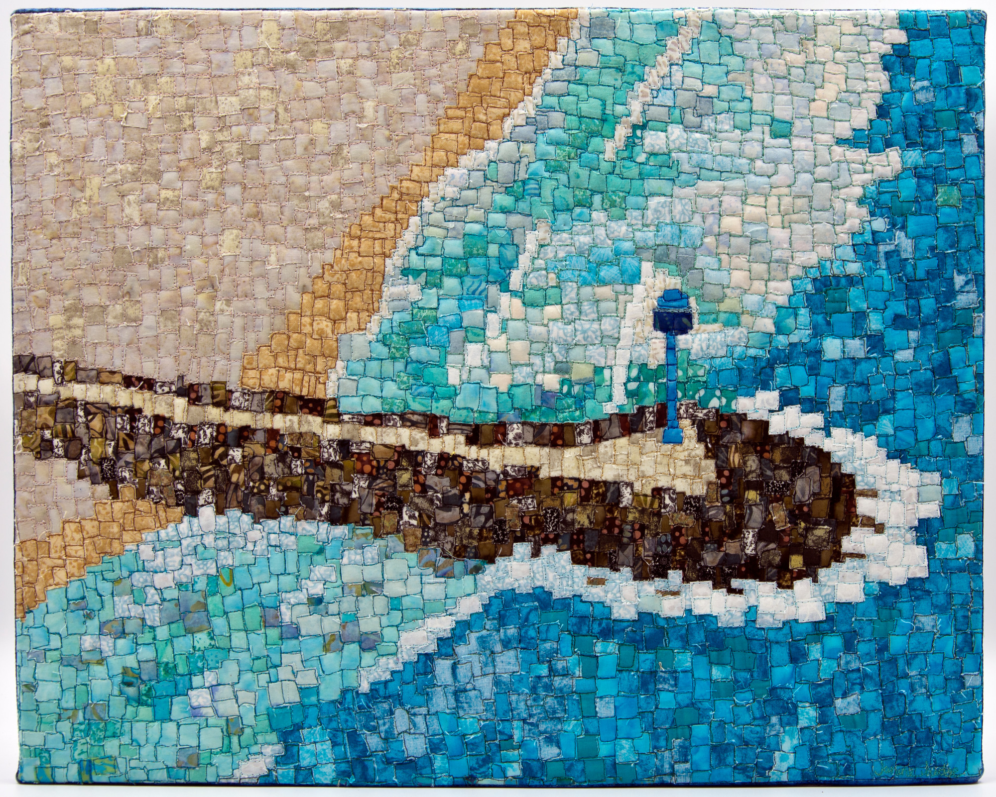 The sapphire blue sea, turns a dazzling white, as it crash into the rocks that make up the protective groyne.