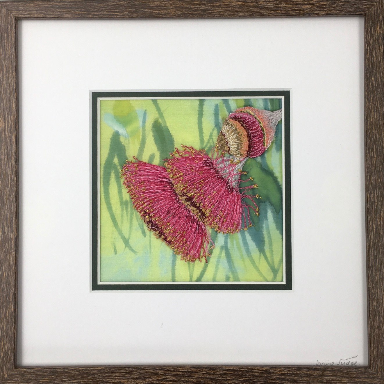 Spectacular flowering gum with striking pink flowers, contrasting yellow stamens and a bud bursting to life.
