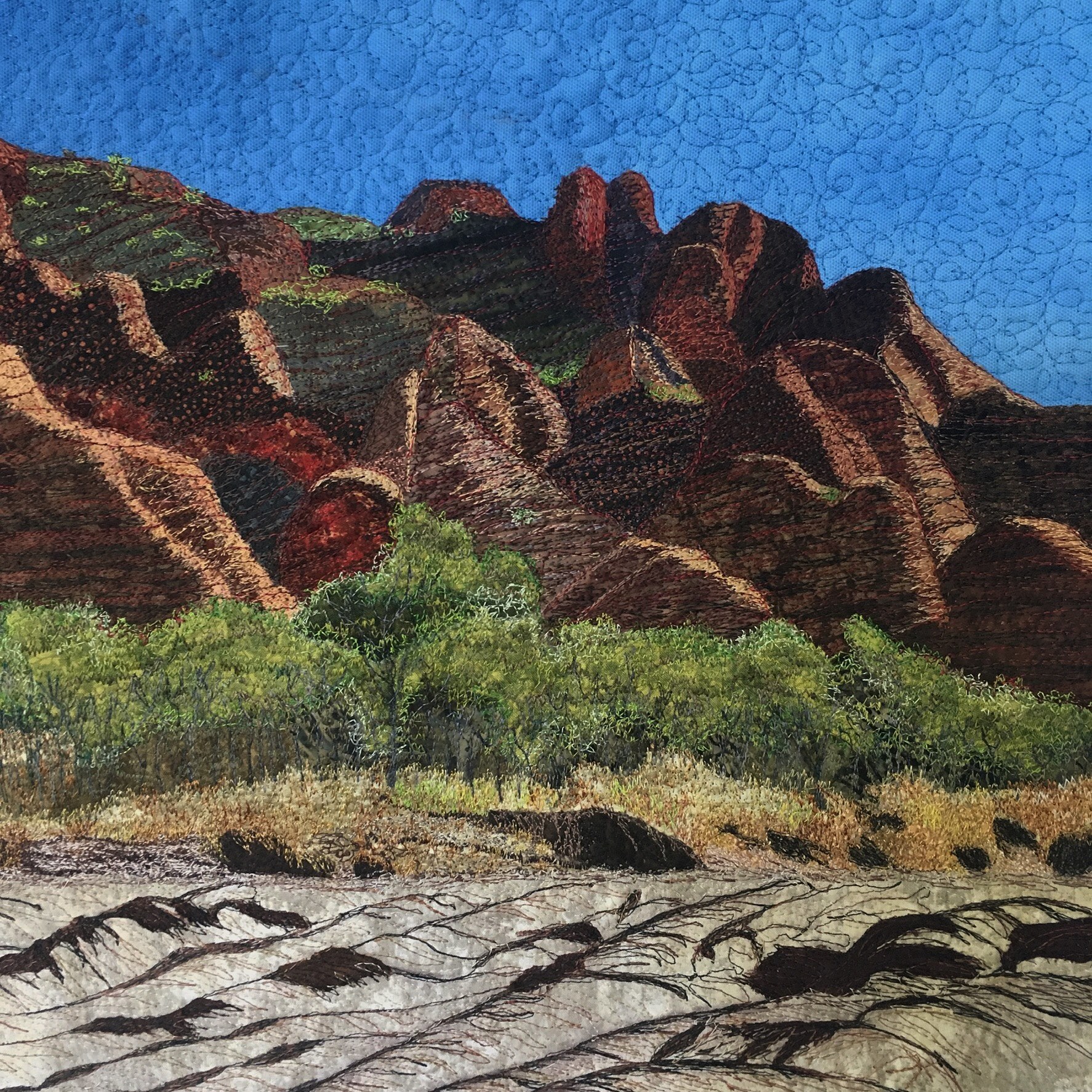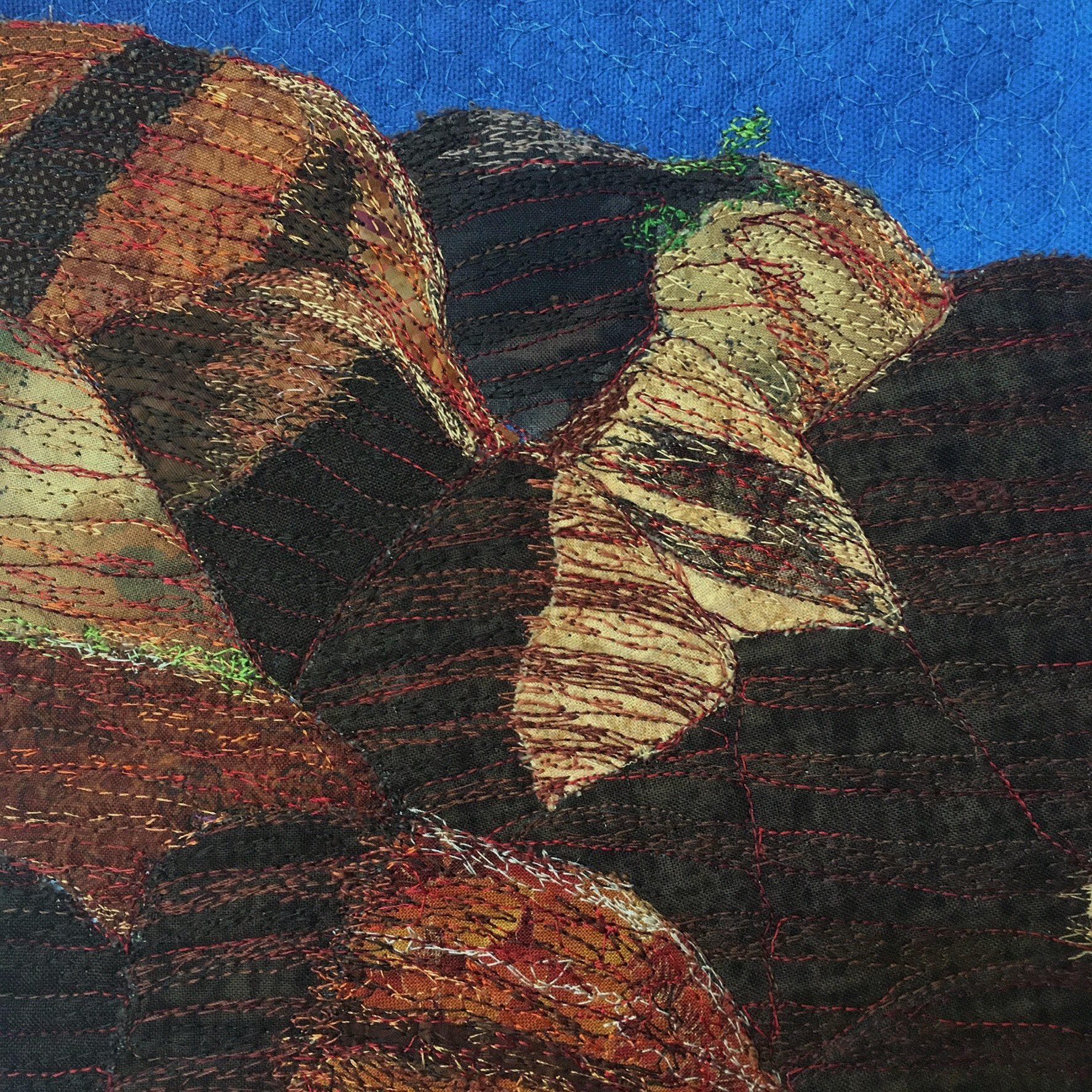 Fabric collage with thread painted details on a sun dyed background.
