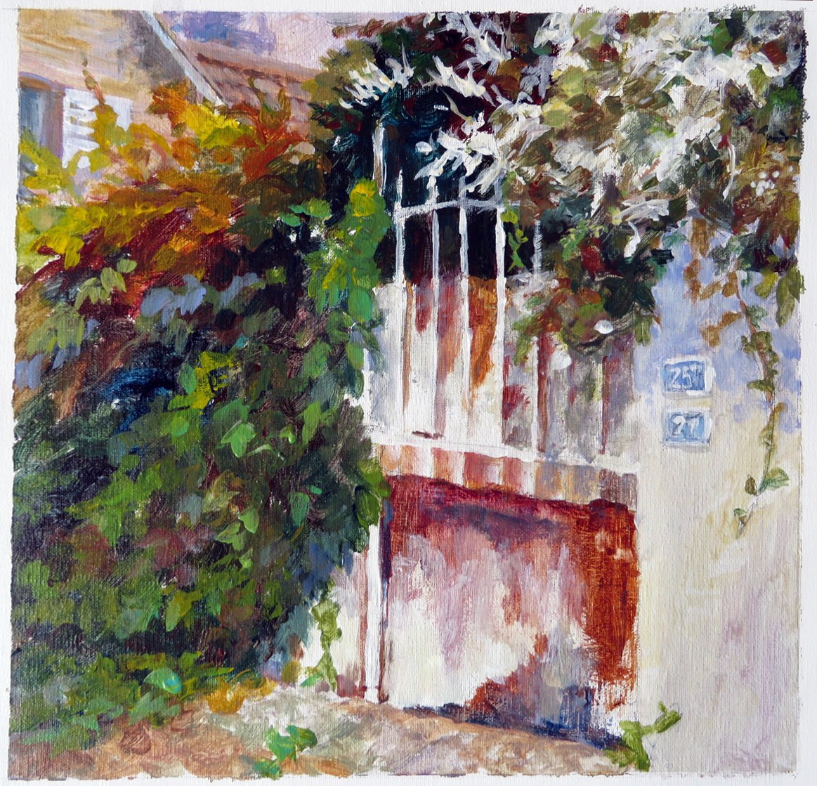There is a wonderful 3-mile walk from the train station to Giverny, Monet’s home and garden. A short train ride from Paris takes you to Giverny; most visitors take a bus from the station to Giverny and miss this very scenic walk. I could well imagine Monet walking down the lane. My artist friend and I sat down on the street with our small set of paints; this was the result.