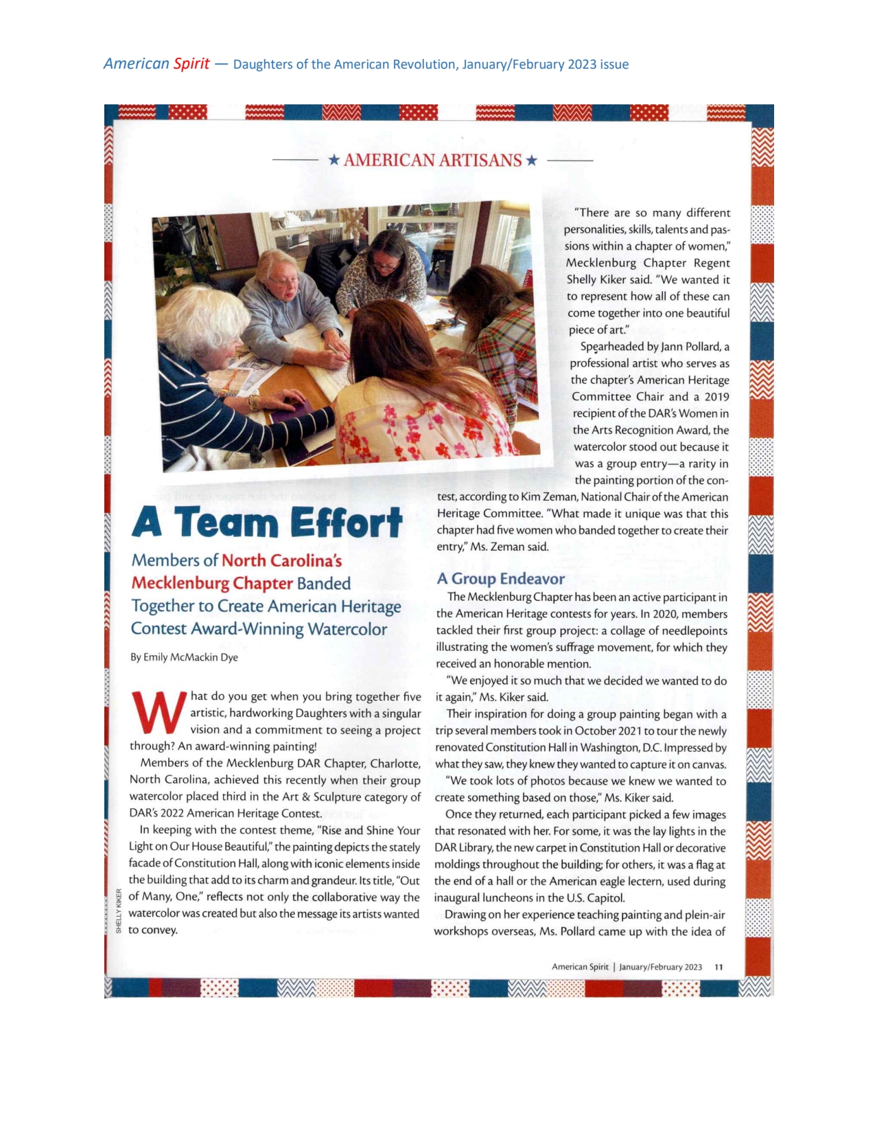 A DAR Group Watercolor Entry for the American Heritage Competition 2022, "Rise and Shine Your Light on Our House Beautifull". Five artists were: Jann Pollard, Ann Del Vecchio, Shelly Kiker, Courtney Layne, and Jenny Tolson. Review the document detail to read about the process of painting watercolor on rice paper and the wonderful article in "American Spirit" magazine.