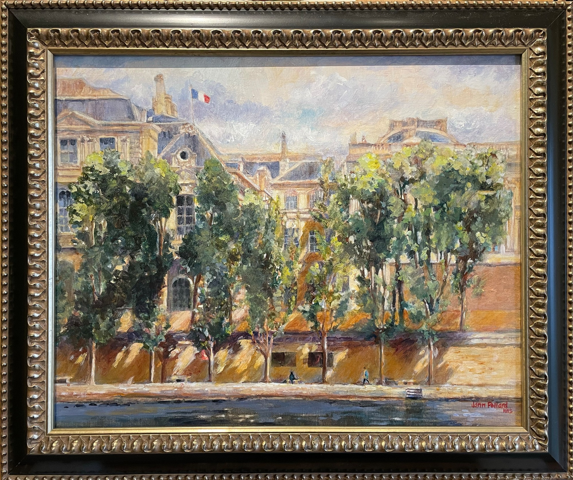 Sitting on the banks of the Seine while soaking in the sun is a Parisian past time. The quays allow the visitors to walk along the river. Their presence helps to illustrate the scale of these trees and buildings. Often these trees that have been planted on the quays create wonderful shadows as seen from the water. Using a limited palette and Impressionistic brushstrokes helped me to create the mood that was inspiring me.