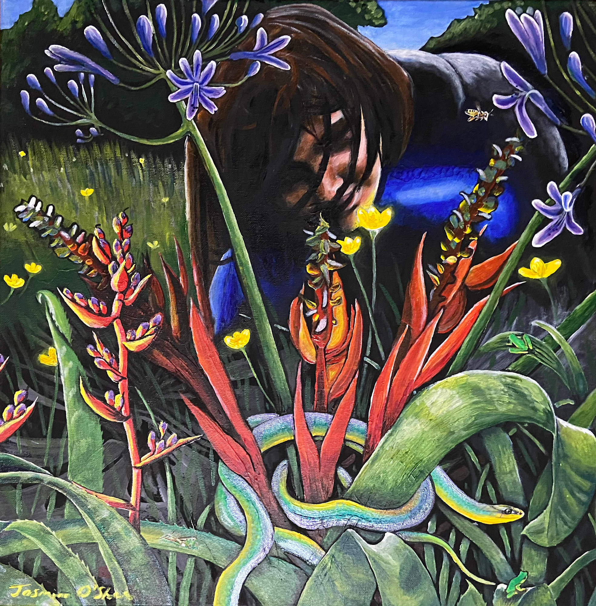 This artwork I started when I first saw this garden on the edge of the Australian rainforest. Surrounded by little lives . Spending time observing their interactions. Anyone who has spent time observing will be inspired by this image. Bring this colourful, joyful work into your home.