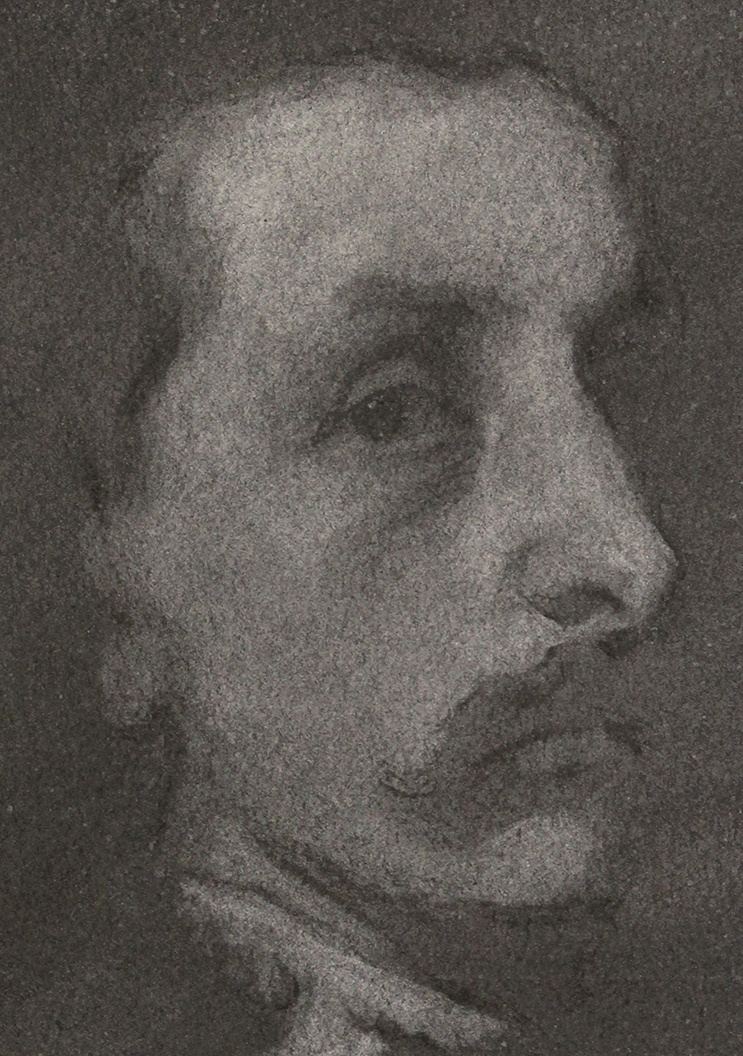 Reductive study after a self portrait made by Anthony van Dyck. Toned with charcoal and then rubbed off to group halftone and highlights. Sharper charcoal is used to create sharper and harder edges.
