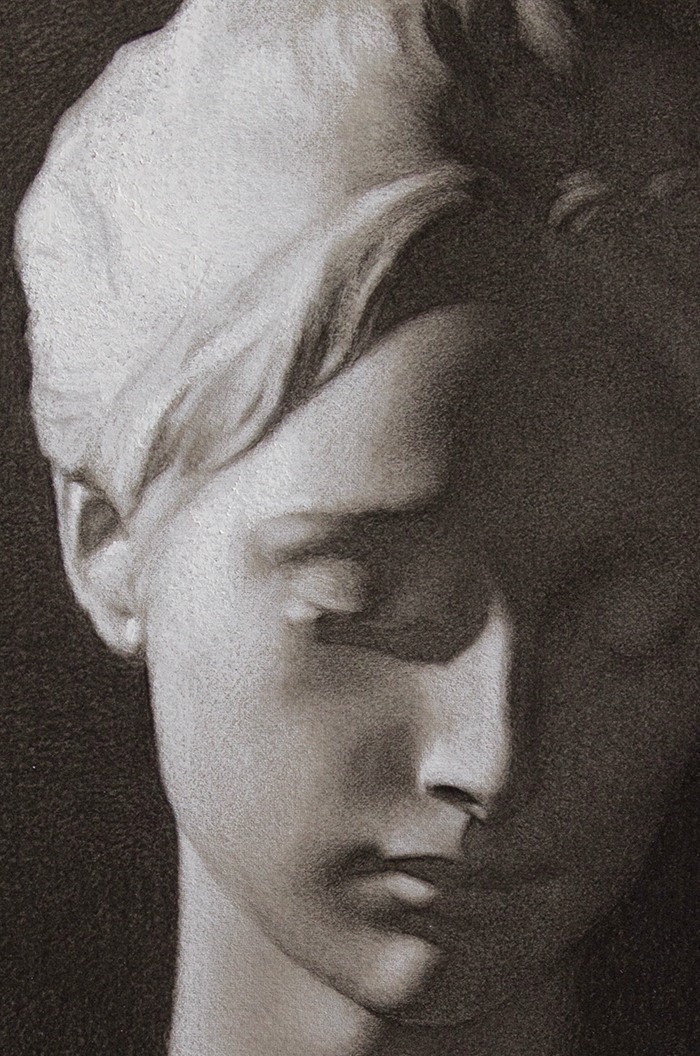 Cast by artist Gaetano Cellini, drawn from life at The Glasgow Academy of Fine Art. Nitram Charcoal with white chalk on hand toned Arches watercolour paper.