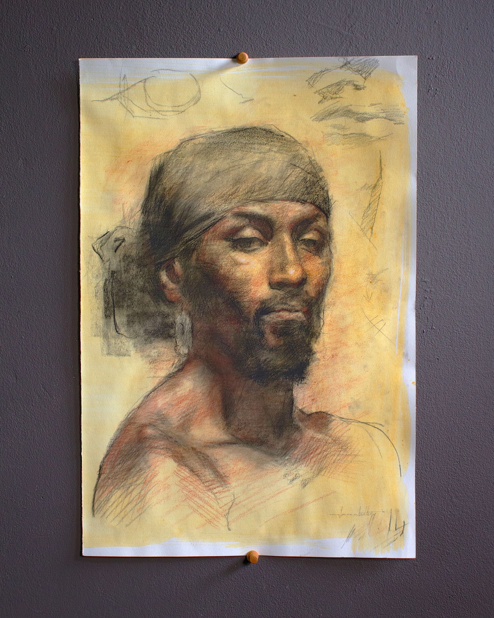 Portrait of Arnold in Trois Crayon. Charcoal, sanguine, and white chalk on toned paper using a mix of raw sienna watercolour, calcium carbonate, and paster ground textured acrylic primer.