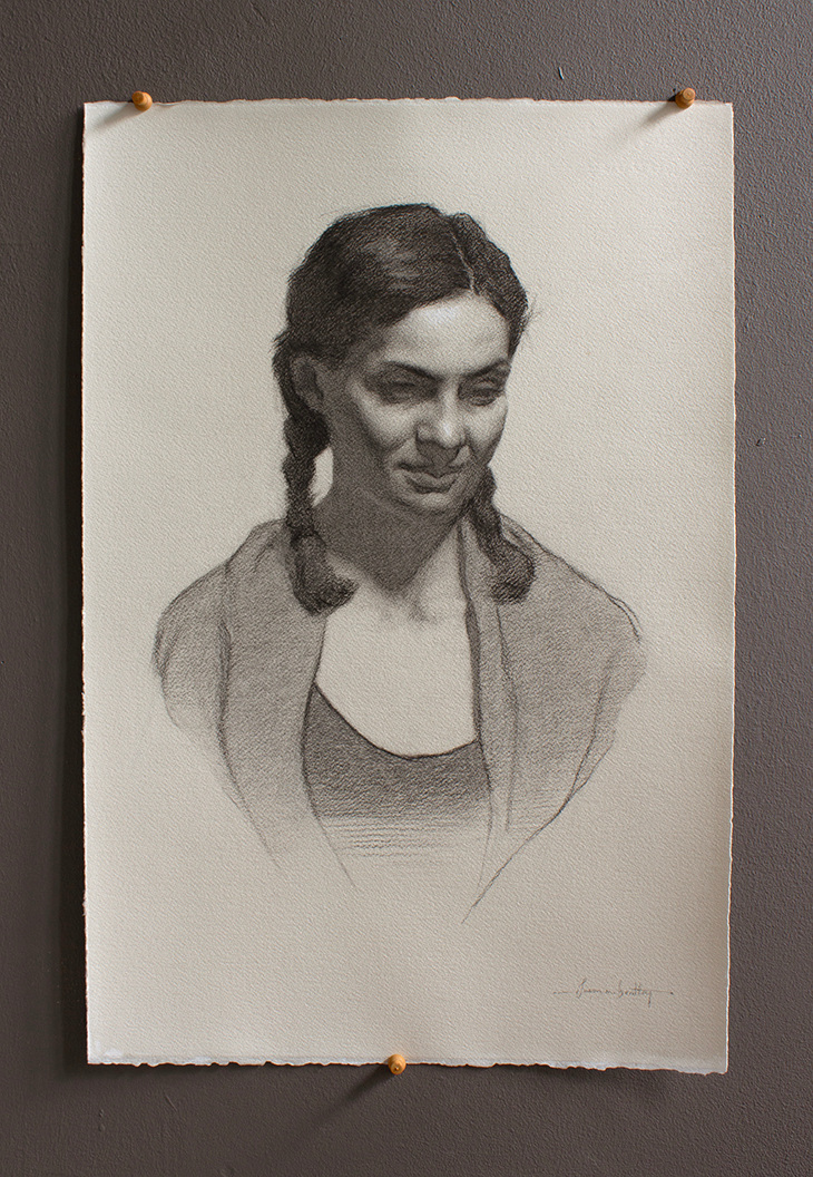 Cirila drawn from life at The Glasgow Academy of Fine Art. Nitram charcoal and white chalk on hand toned Arches watercolor paper.