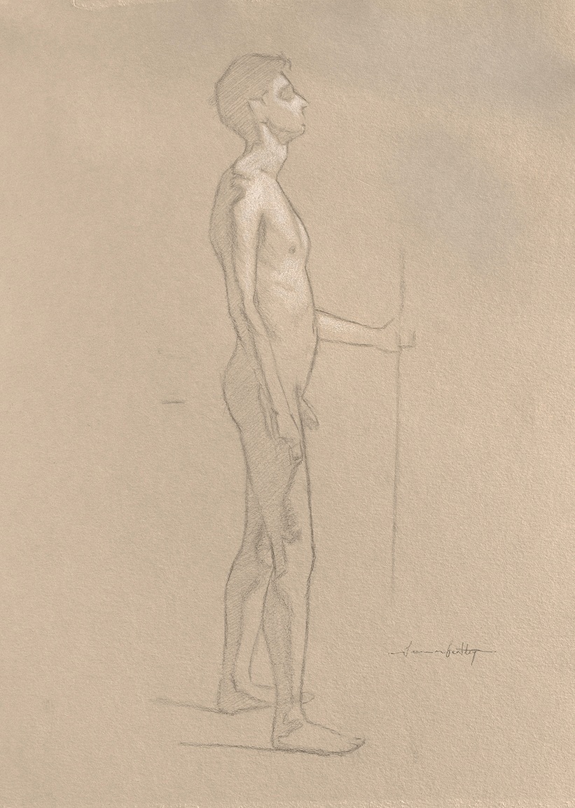 Drawing from life. Model at the Glasgow Academy of Fine Art. Standing profile pose. I believe this was the first time I used a little white chalk to complete the form.