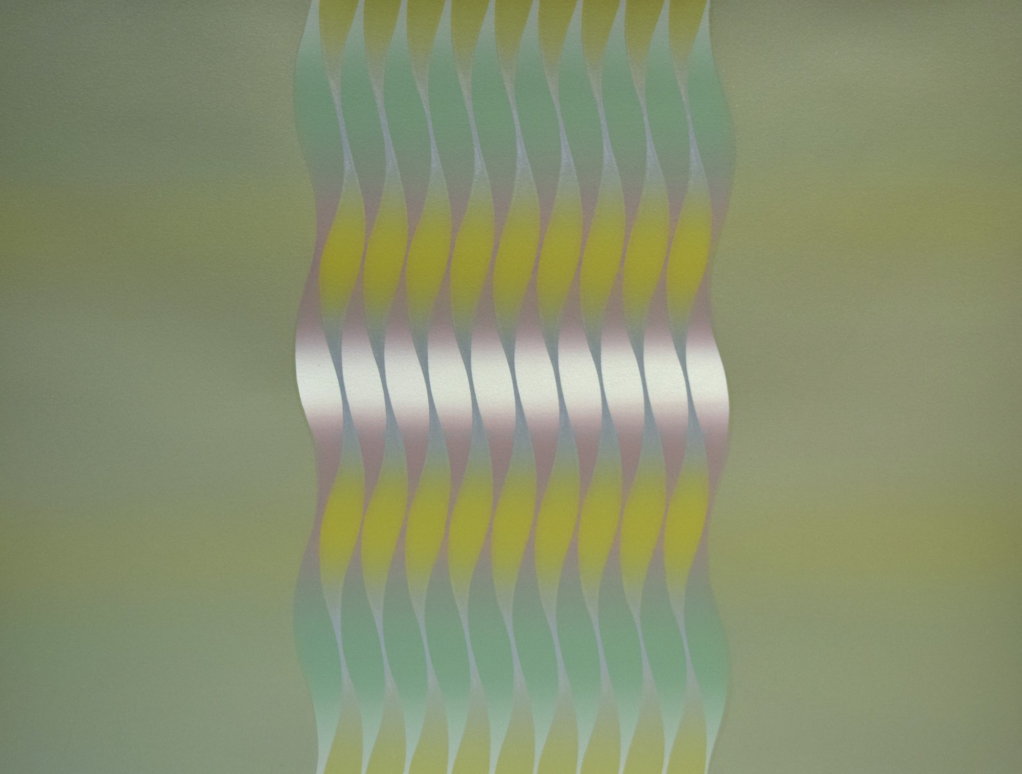 Geometric wave form across the central section. Background is a solid avocado green. Wave form coloration is comprised of two separate rainbow rolls that alternate from each band.