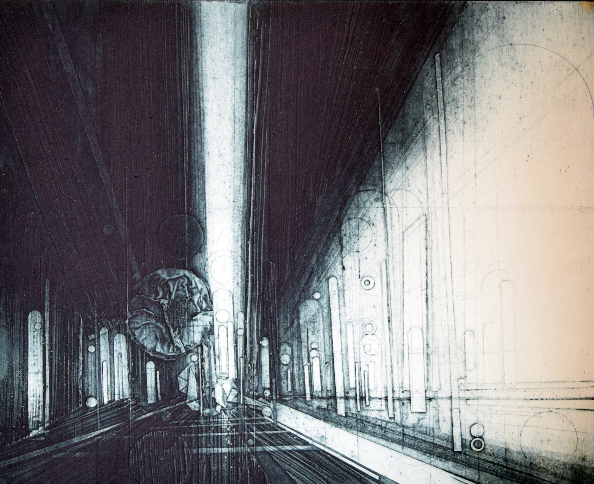 Interior of a cathedral with the focus on the nave. One of many studies done by the artist using church interiors to work with light and structure. The nave is the central part of a church building, intended to accommodate most of the congregation. In traditional Western churches it is rectangular, separated from the chancel by a step or rail, and from adjacent aisles by pillars.