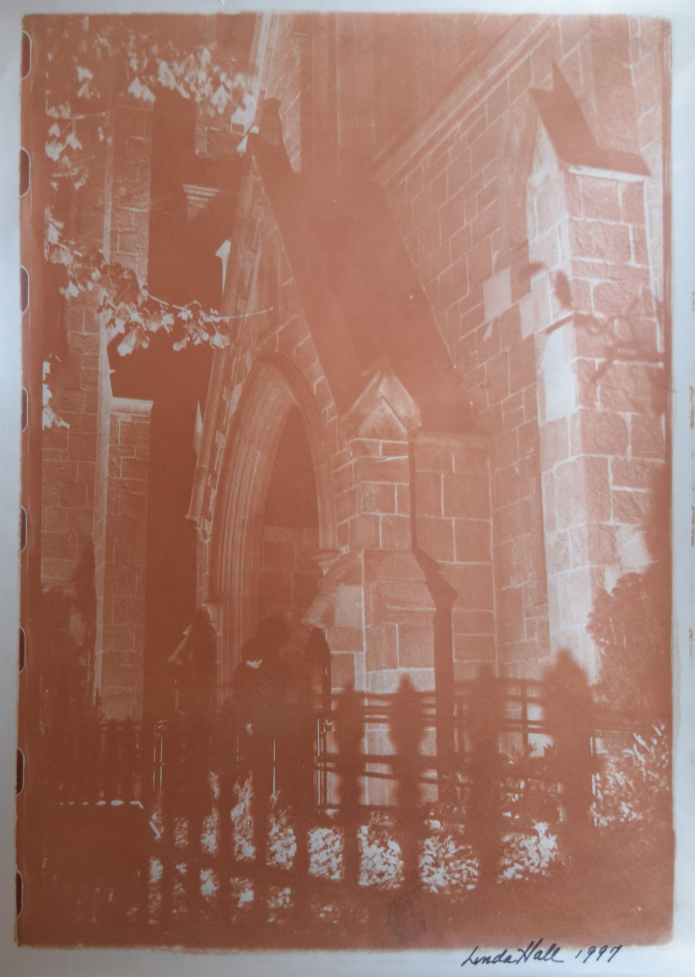 Sepia photograph on silver paper of a Gothic church.