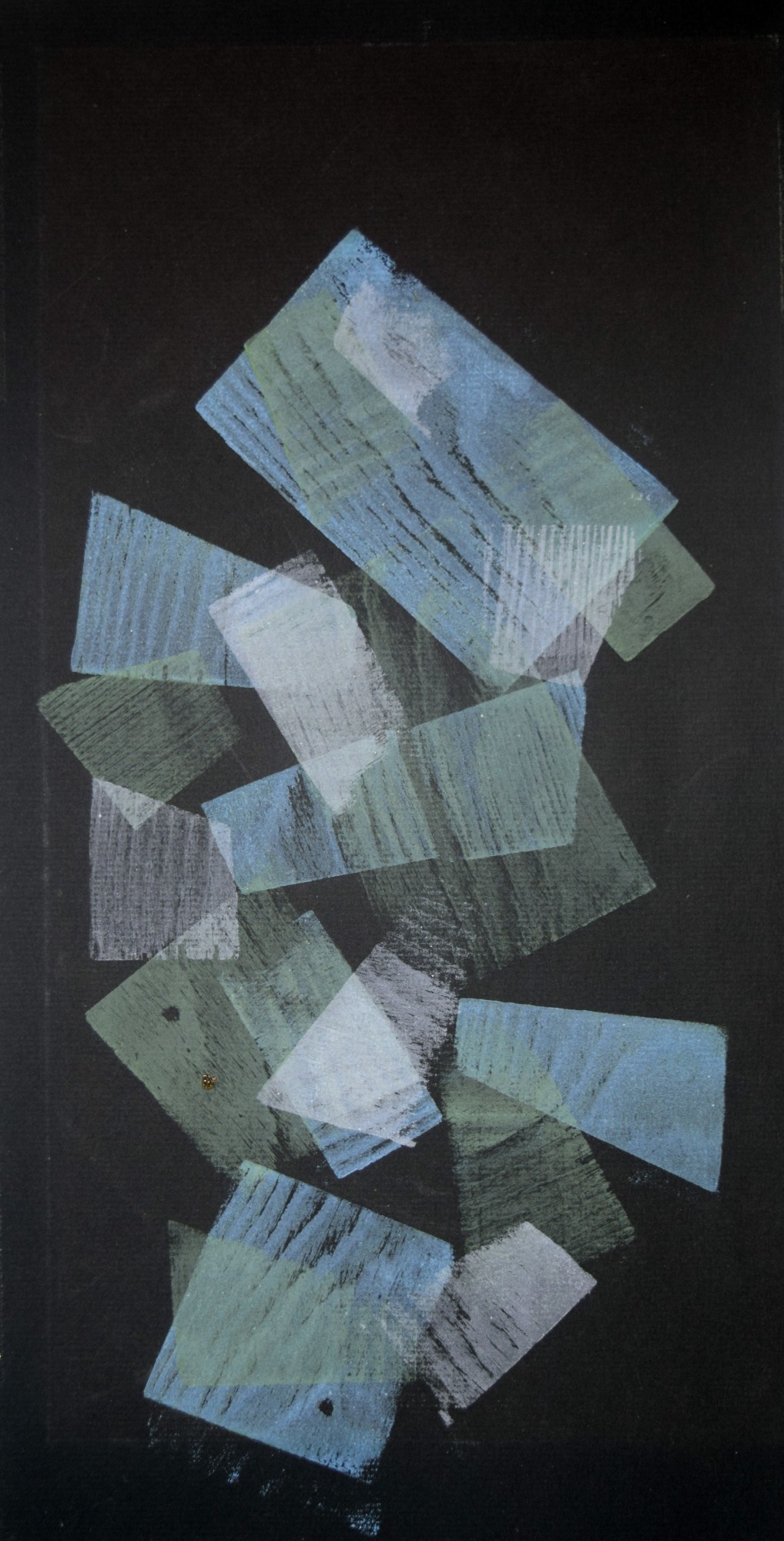 Various shapes of wood that have been inked to highlight the grain has been pressed in an overlay pattern on block paper. This print was attached to the lithography 'Black Rooster' acc: 240107.14