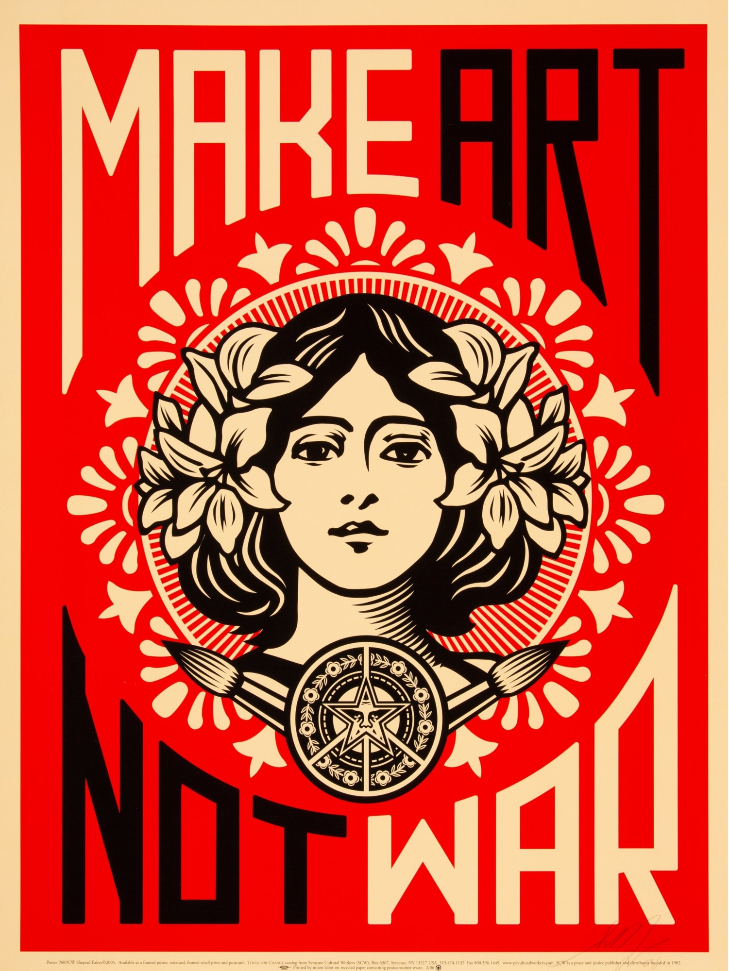 This print, created during the Iraq war, is an alternative phrase inspired by popular 1960s anti-war mantra, “Make love, not war.” In this case, Fairey asserts the need for creative rather than destructive acts. The Art Nouveau style of the image is an additional reference to the influence of Art Nouveau on hippie and psychedelic art of the ‘60s, including many anti-Vietnam war posters.