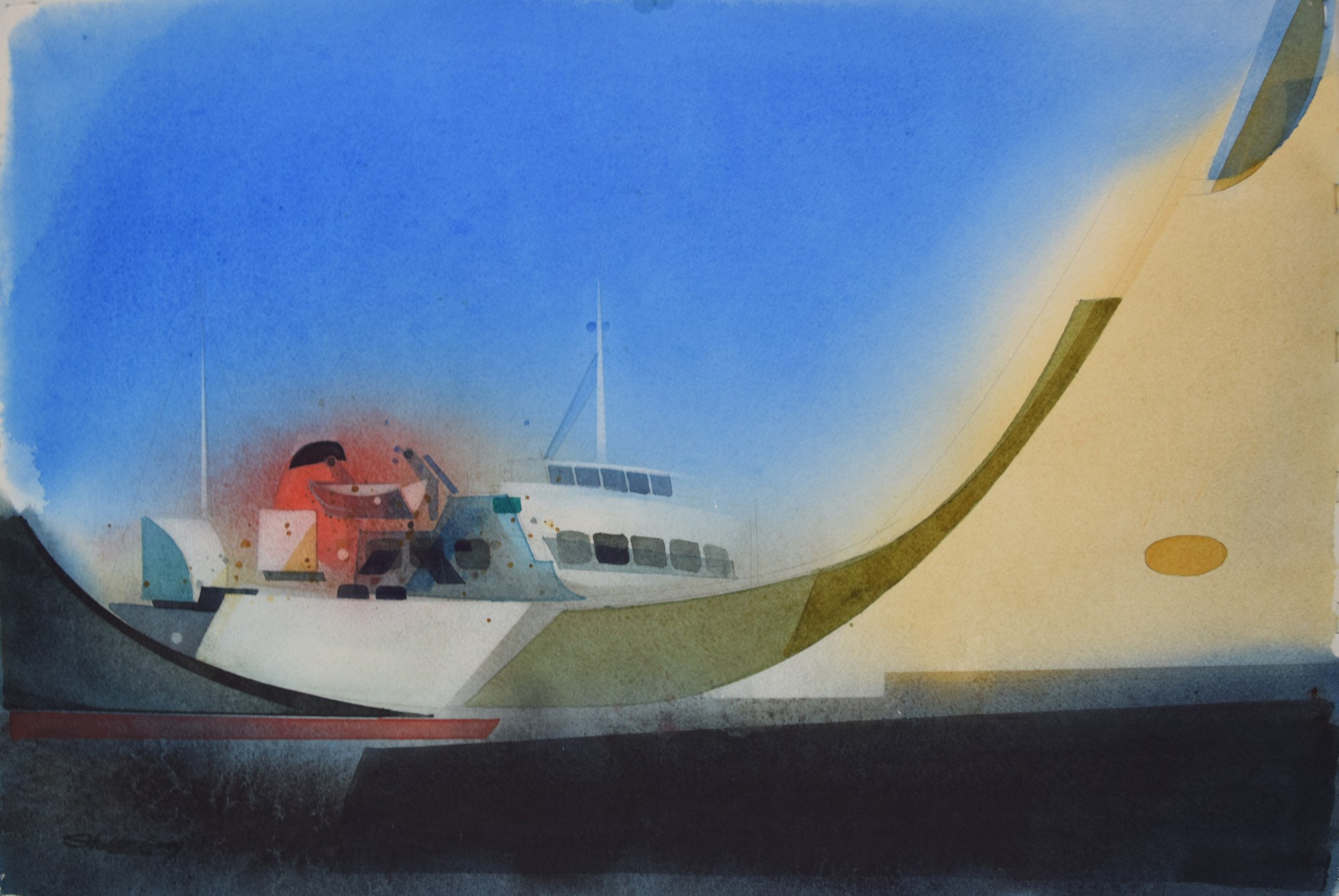 Study of an ocean liner with a red funnel painted from an adjacent ship.