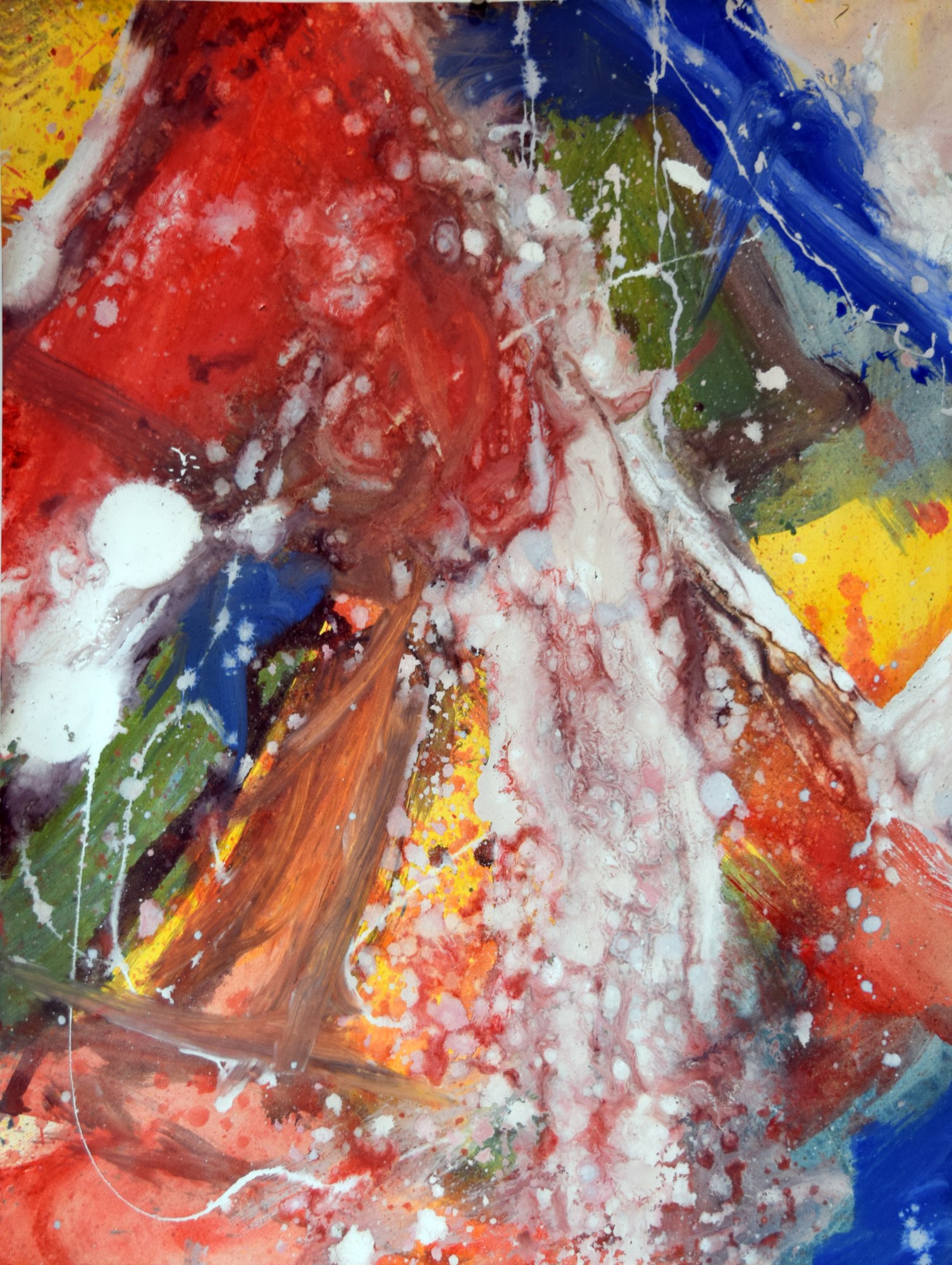 A colorful and expressionistic abstraction using acrylic paint and fine sand.