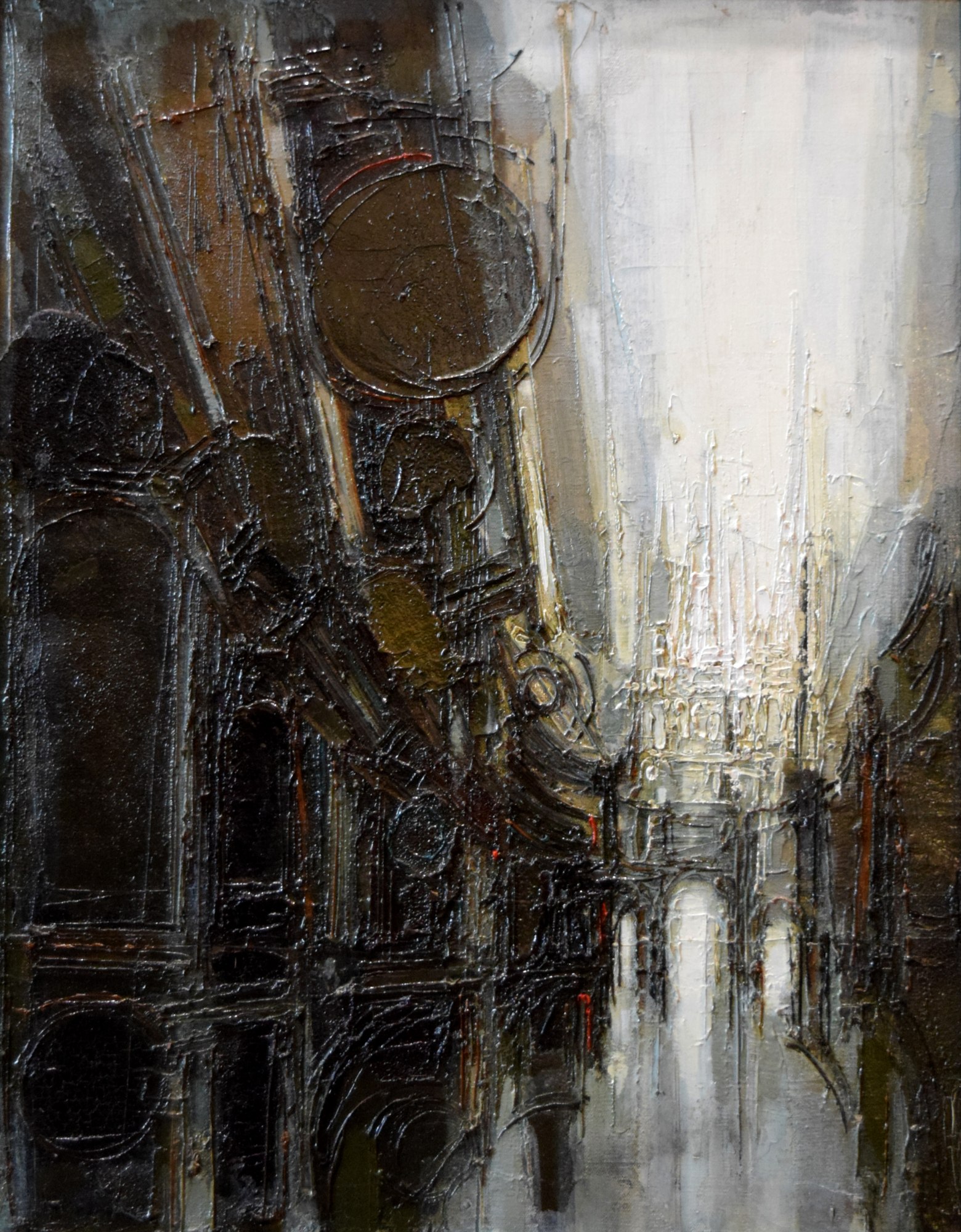 An early oil painting by Donald Stoltenberg the demonstrates his exploration of light within the interior of a cathedral. This painting shows his early monochromatic palette. The surface is richly built up with layer of paint that becomes a sculptural surface.