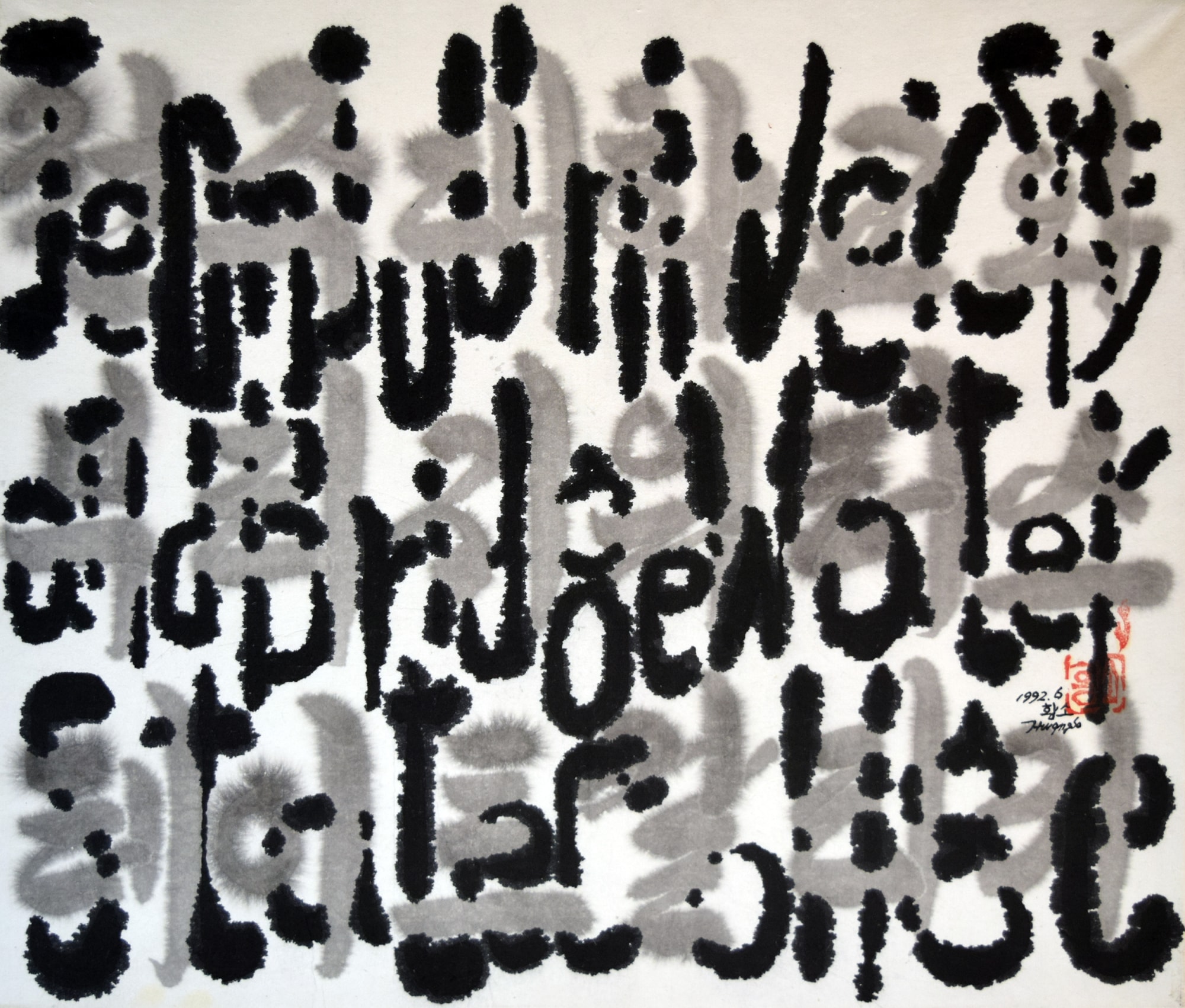 Abstract black ink marks/characters. There is a lighter layer or markings beneath the larger black marks. The rice paper is attached to stretched canvas.