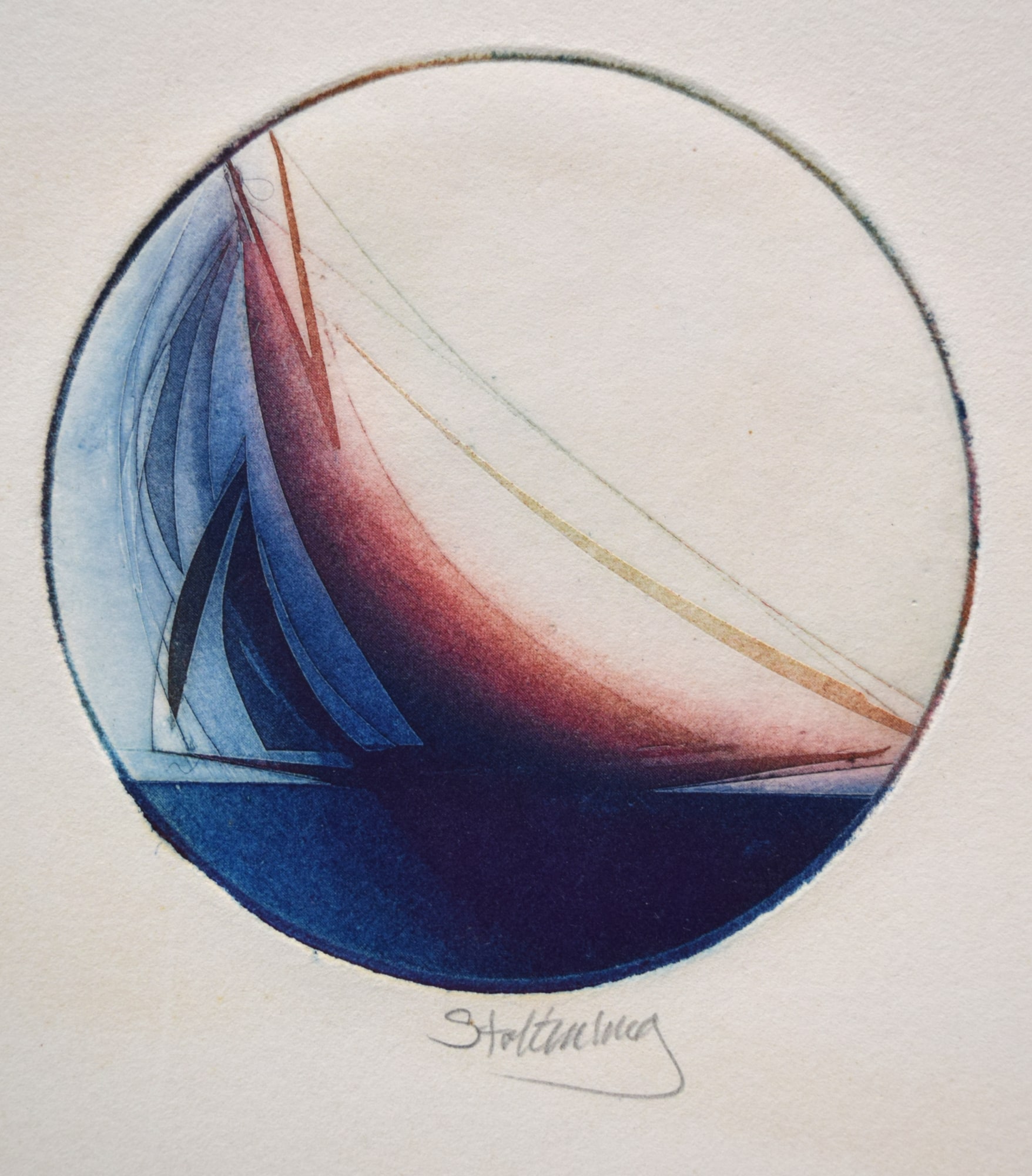 The artist explores the dynamic motion and speed of a fully rigged sloop in a futurist manner.