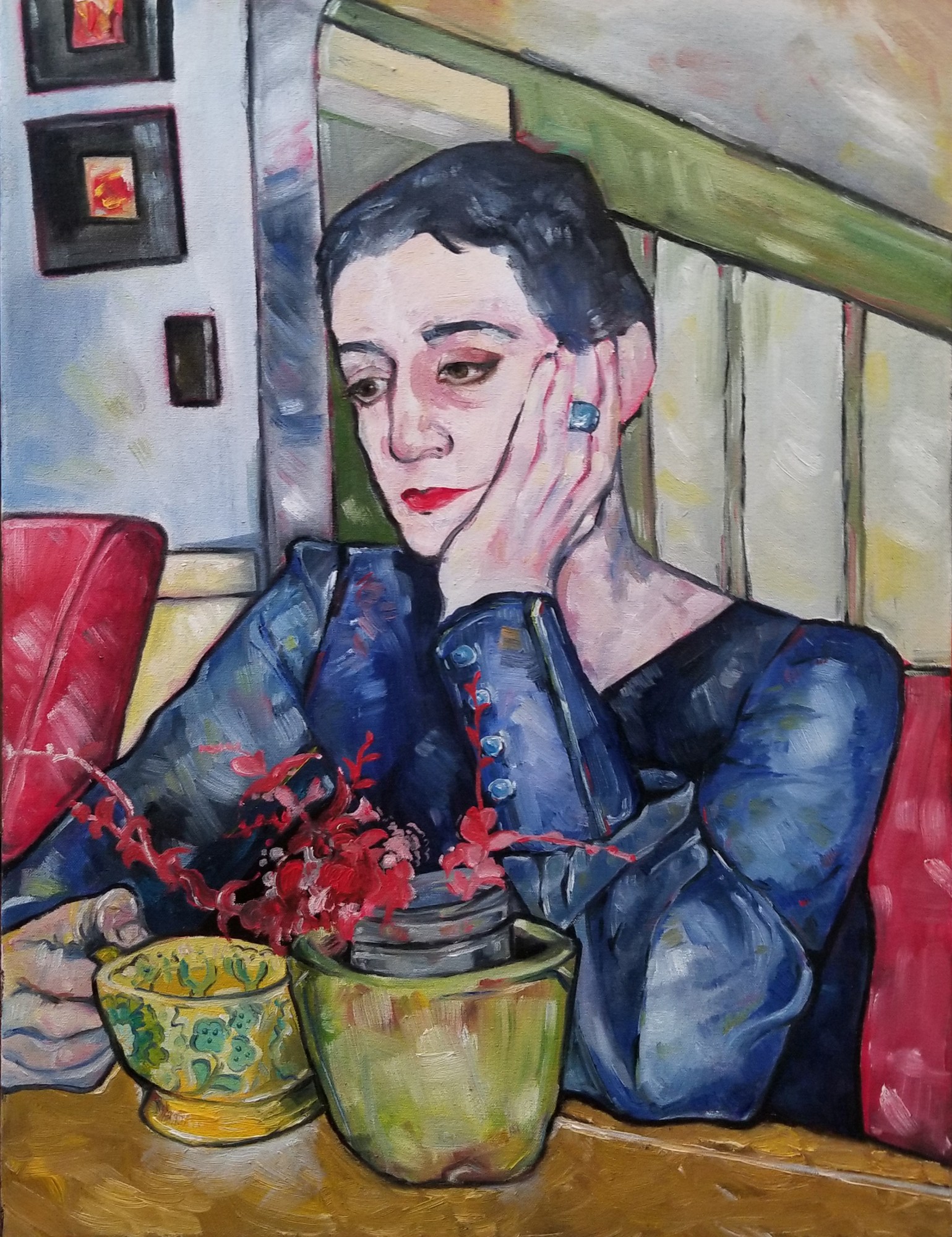 Portrait of a woman w/tea cup done in the Post-Impressionist style.