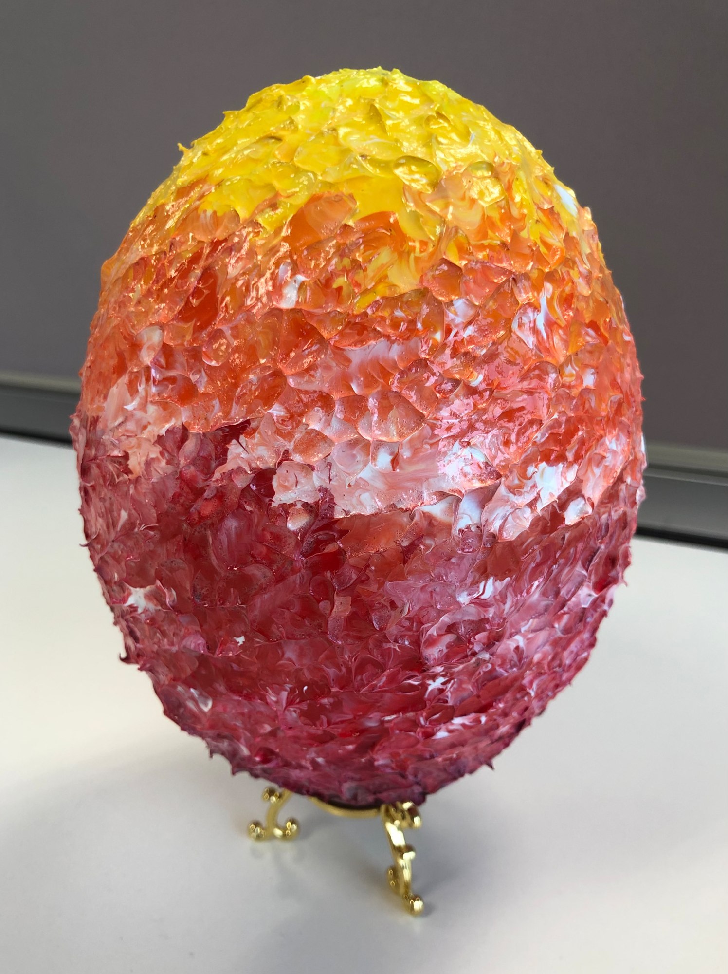 After a collection of ten small eggs ~ acrylic paint on styrofoam egg-shaped forms, here is my first 'real' egg ~ acrylic paint on an ostrich egg shell! From the five I bought, each has a unique size, unique shape and unique idiosyncrasies ~ just beautiful on its own!