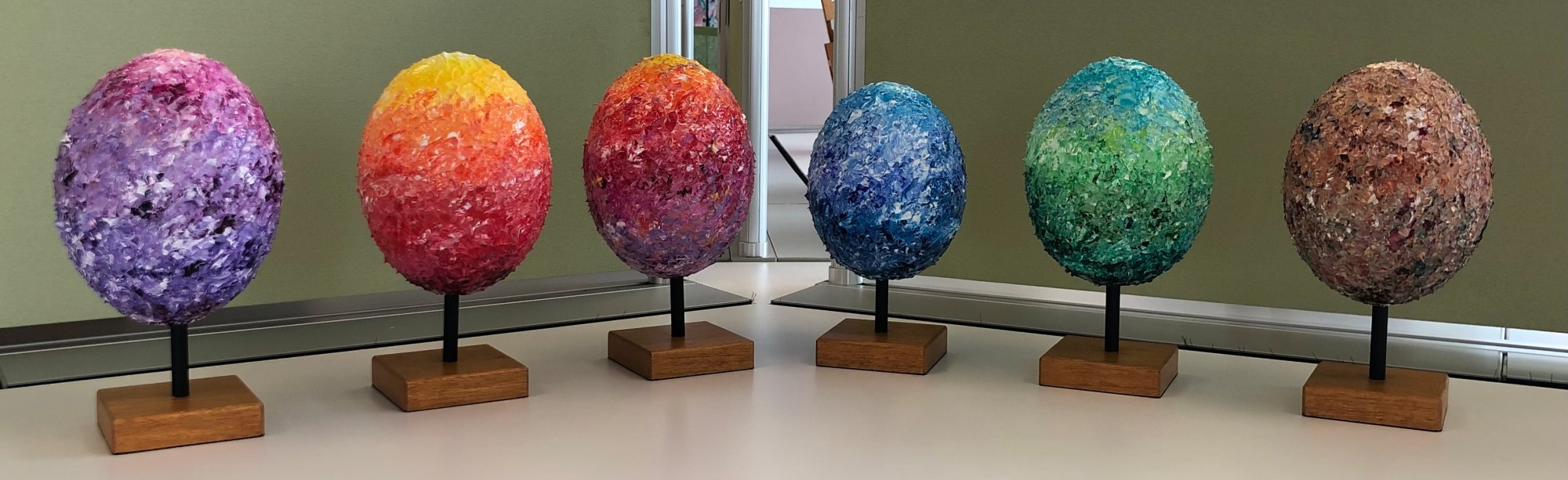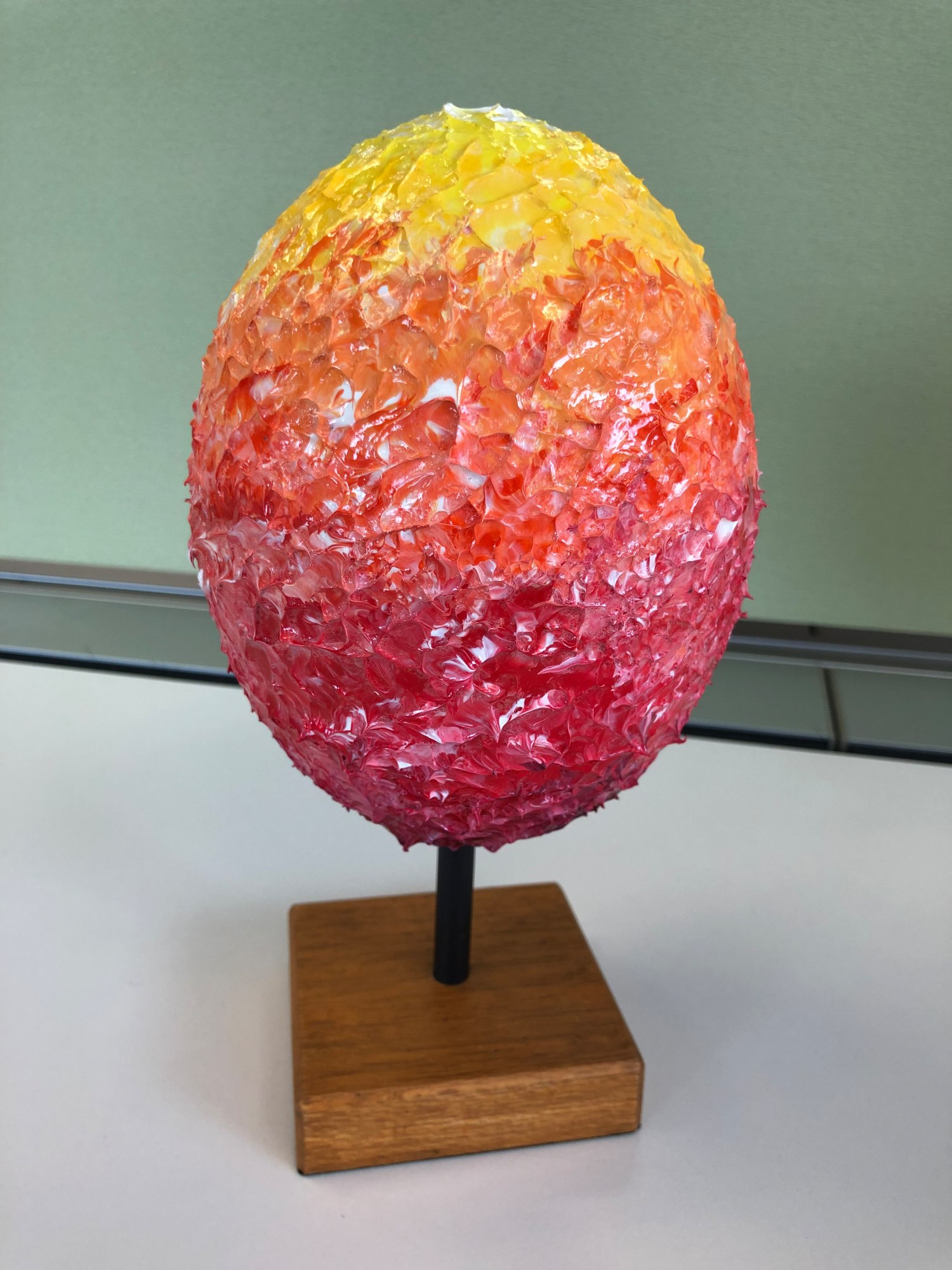 After a collection of ten small eggs ~ acrylic paint on styrofoam egg-shaped forms, here is my first 'real' egg ~ acrylic paint on an ostrich egg shell! From the five I bought, each has a unique size, unique shape and unique idiosyncrasies ~ just beautiful on its own!