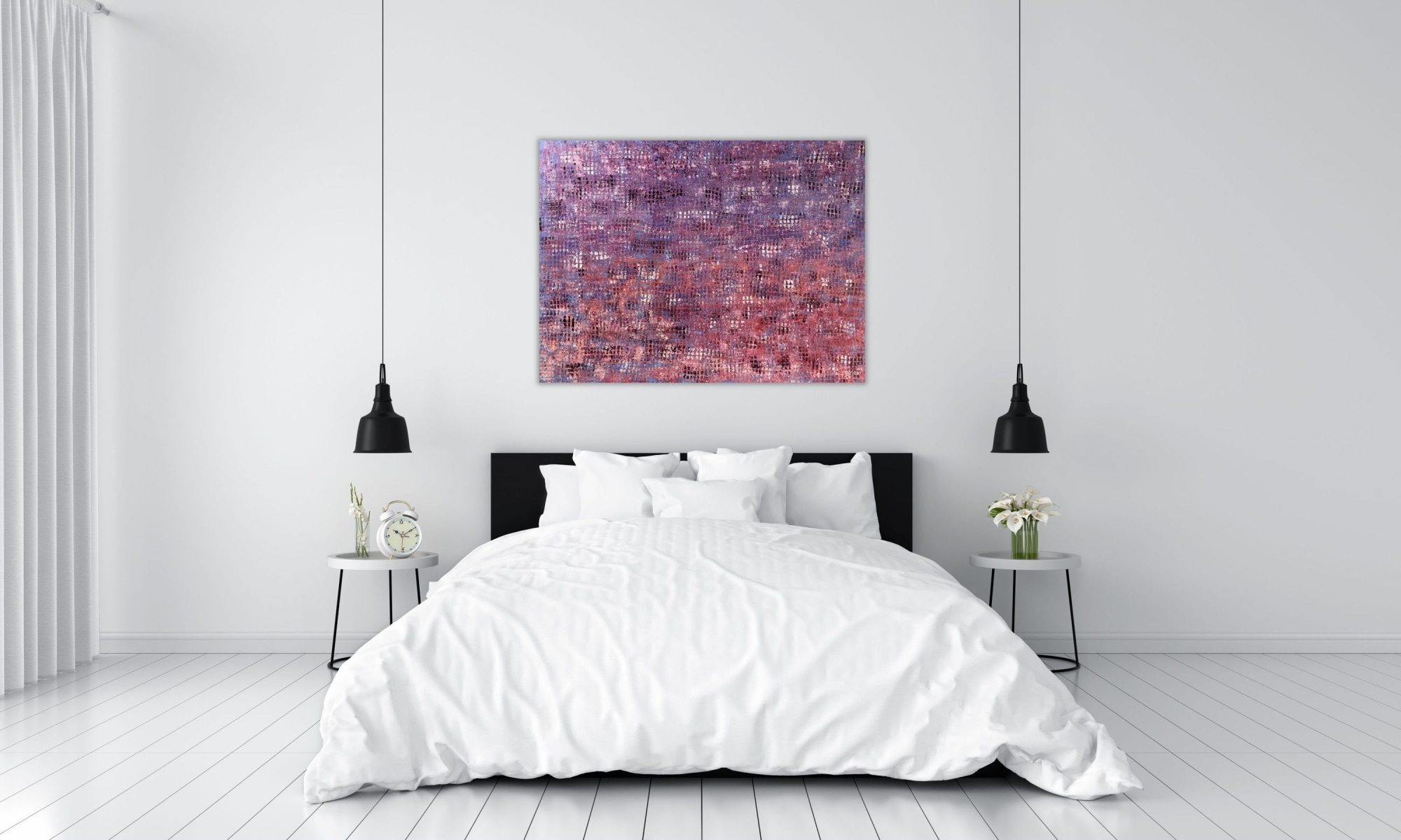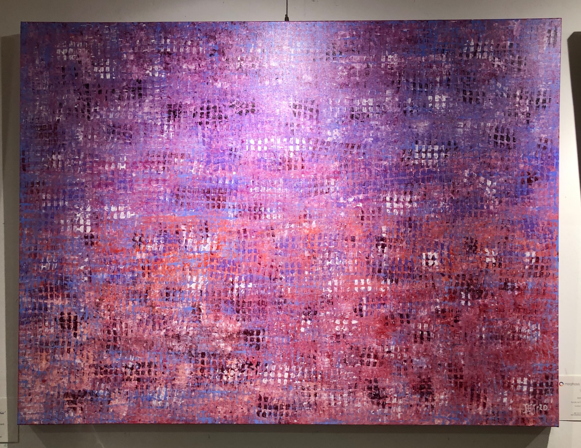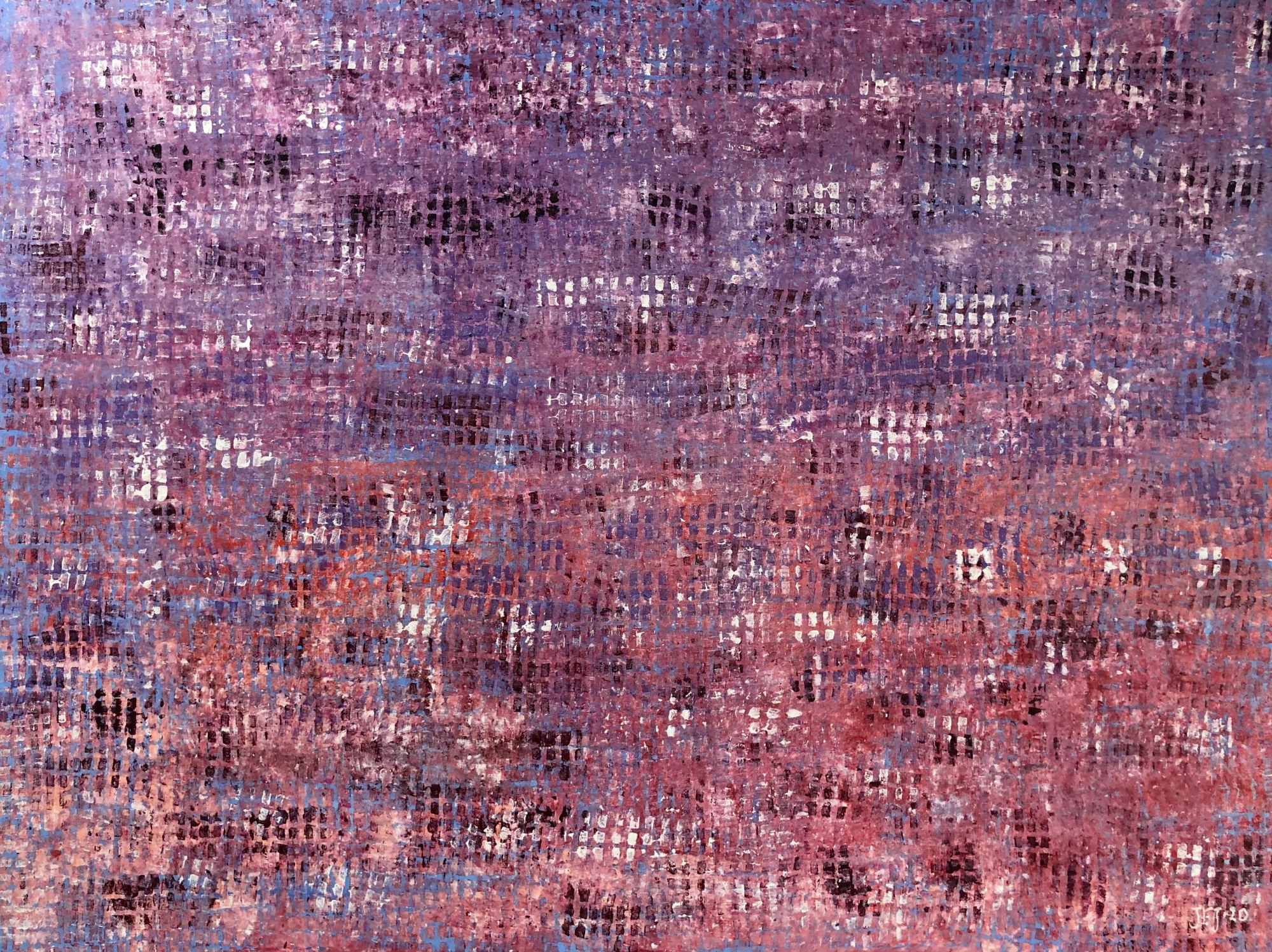 My largest artwork today, painted in three layers ~ one layer of coloured Gesso in shades of blue, followed by two layers with a shaped roller, with a range of colours from red to violet, and white.