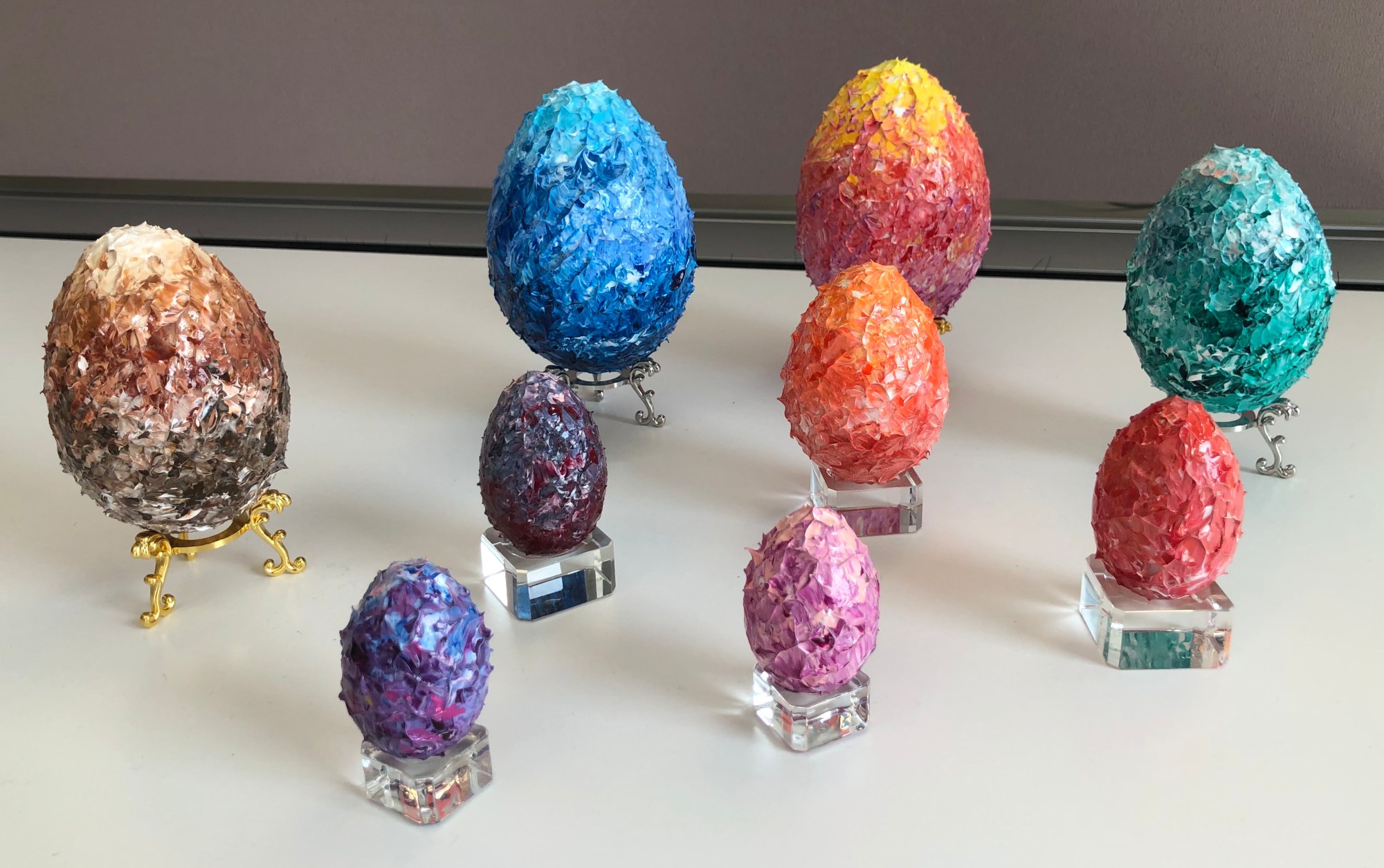 Following an initial experiment with painting an egg-shaped 3D surface, I am back with a series of nine 'eggs', of five different sizes and many different colours, to be enjoyed individually or together.