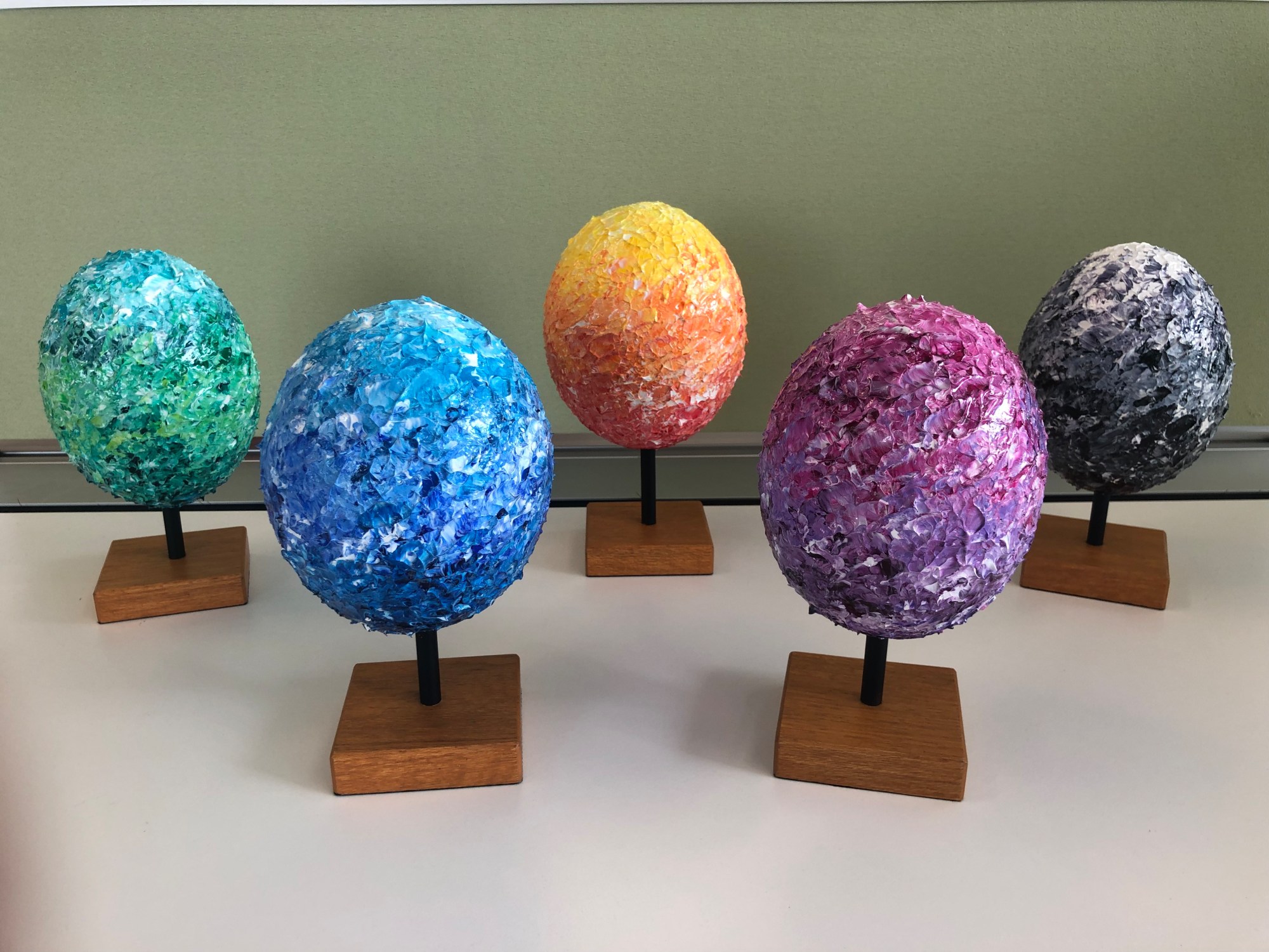 After a 2021 collection of nine 'eggs' painted on styrofoam and a 2022 collection of another nine eggs painted on Malaysian ostrich egg shells, here is our 2023 collection, back by popular demand!