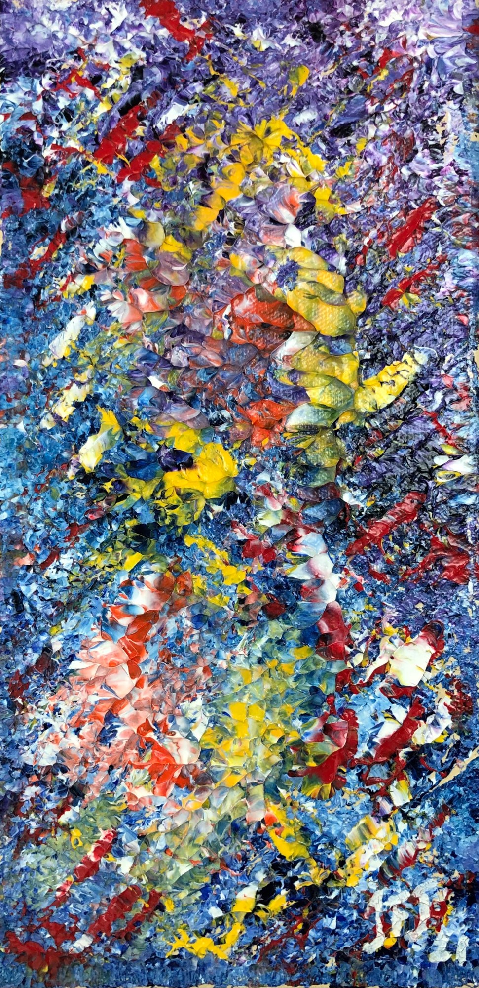 Upon returning from a three month summer holiday in Europe, it is the first of two artworks I created, mirror images of each other as they were merged together while wet, before returning to being unique. Head or tails ~ which is which? Maybe coming as a pair